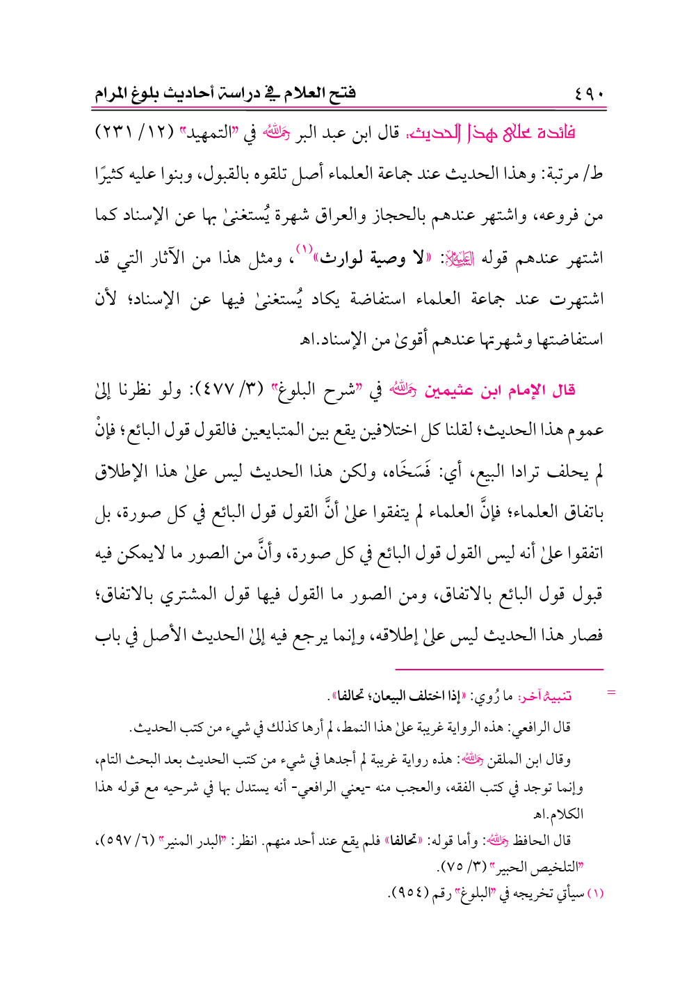 فائدة على هذا الحديث: قال ابن عبد البر -رحمه الله- في «التمهيد» (١٢/ ٢٣١) ط/مرتبة: وهذا الحديث عند جماعة العلماء أصل تلقوه بالقبول، وبنوا عليه كثيرًا من فروعه، واشتهر عندهم بالحجاز والعراق شهرة يُستغنى بها عن الإسناد كما اشتهر عندهم قوله -عليه السلام-: «لا وصية لوارث» (¬١)، ومثل هذا من الآثار التي قد اشتهرت عند جماعة العلماء استفاضة يكاد يُستغنى فيها عن الإسناد؛ لأن استفاضتها وشهرتها عندهم أقوى من الإسناد. اهـ