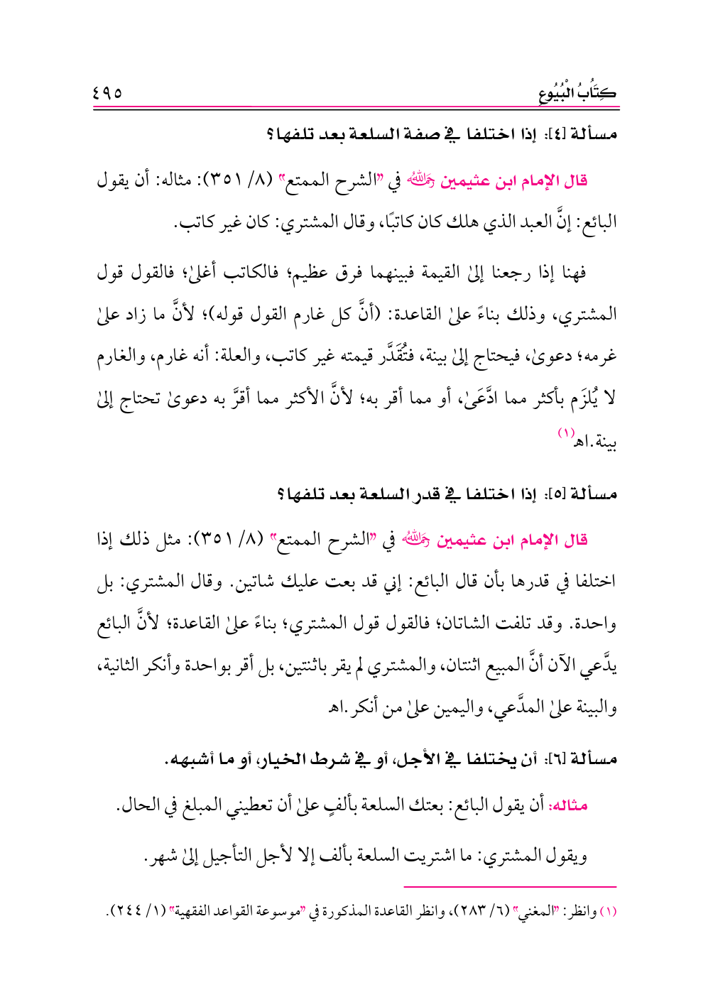 قال الإمام ابن عثيمين -رحمه الله- في «الشرح الممتع» (٨/ ٣٥١): مثاله: أن يقول البائع: إنَّ العبد الذي هلك كان كاتبًا، وقال المشتري: كان غير كاتب.