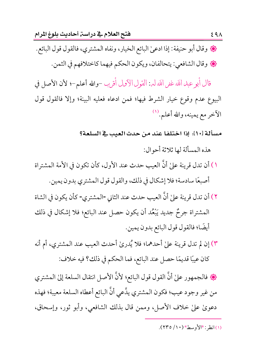 • فالجمهور على أنَّ القول قول البائع؛ لأنَّ الأصل انتقال السلعة إلى المشتري من غير وجود عيب؛ فكون المشتري يدَّعي أنَّ البائع أعطاه السلعة معيبة؛ فهذه دعوى على خلاف الأصل، وممن قال بذلك الشافعي، وأبو ثور، وإسحاق،