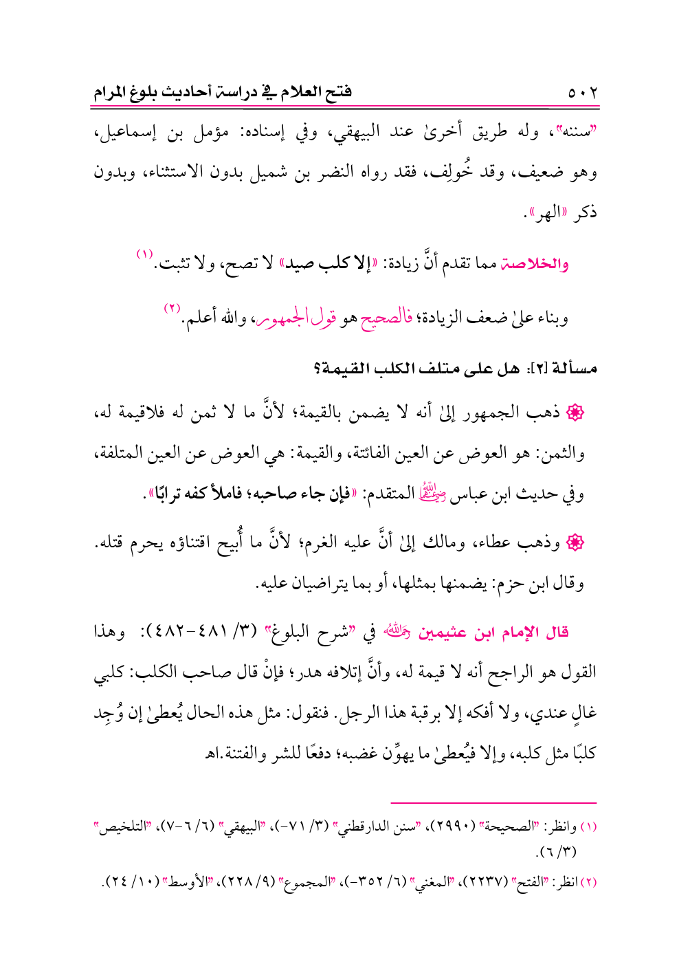 قال الإمام ابن عثيمين -رحمه الله- في «شرح البلوغ» (٣/ ٤٨١ - ٤٨٢): وهذا القول هو الراجح أنه لا قيمة له، وأنَّ إتلافه هدر؛ فإنْ قال صاحب الكلب: كلبي غالٍ عندي، ولا أفكه إلا برقبة هذا الرجل. فنقول: مثل هذه الحال يُعطى إن وُجِد كلبًا مثل كلبه، وإلا فيُعطى ما يهوِّن غضبه؛ دفعًا للشر والفتنة. اهـ