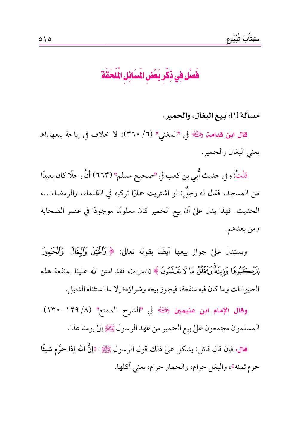 قال: فإن قال قائل: يشكل على ذلك قول الرسول - صلى الله عليه وسلم -: «إنَّ الله إذا حرَّم شيئًا حرم ثمنه»، والبغل حرام، والحمار حرام، يعني أكلها.