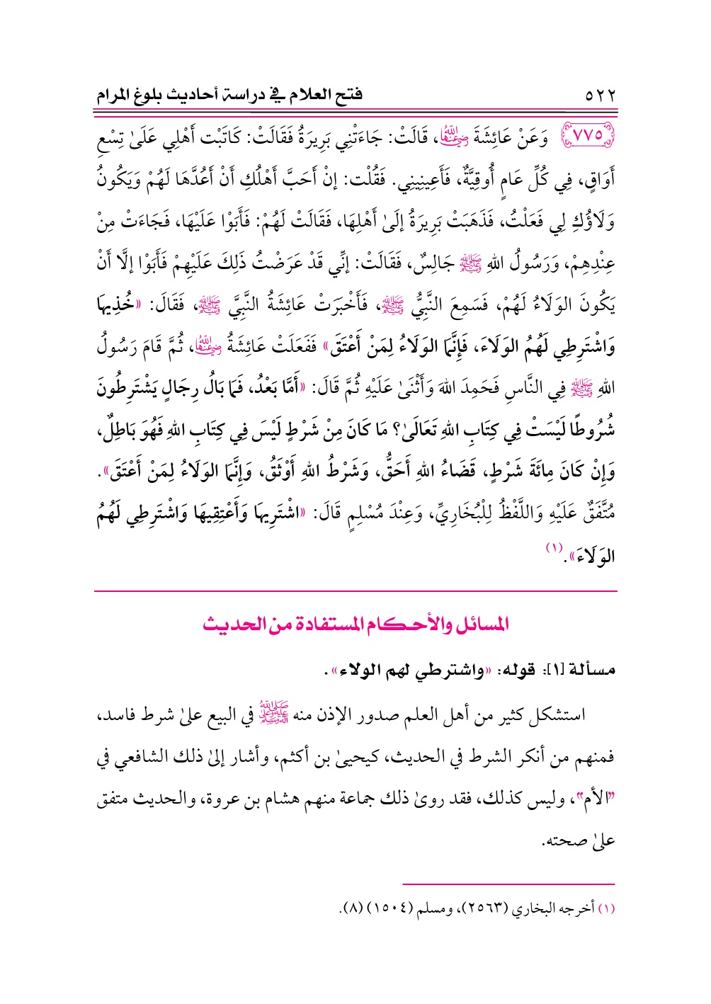 ٧٧٥ - وَعَنْ عَائِشَةَ -رضي الله عنها-، قَالَتْ: جَاءَتْنِي بَرِيرَةُ فَقَالَتْ: كَاتَبْت أَهْلِي عَلَى تِسْعِ أَوَاقٍ، فِي كُلِّ عَامٍ أُوقِيَّةٌ، فَأَعِينِينِي. فَقُلْت: إنْ أَحَبَّ أَهْلُكِ أَنْ أَعُدَّهَا لَهُمْ وَيَكُونُ وَلَاؤُكِ لِي فَعَلْتُ، فَذَهَبَتْ بَرِيرَةُ إلَى أَهْلِهَا، فَقَالَتْ لَهُمْ: فَأَبَوْا عَلَيْهَا، فَجَاءَتْ مِنْ عِنْدِهِمْ، وَرَسُولُ اللهِ - صلى الله عليه وسلم - جَالِسٌ، فَقَالَتْ: إنِّي قَدْ عَرَضْتُ ذَلِكَ عَلَيْهِمْ فَأَبَوْا إلَّا أَنْ يَكُونَ الوَلَاءُ لَهُمْ، فَسَمِعَ النَّبِيُّ - صلى الله عليه وسلم -، فَأَخْبَرَتْ عَائِشَةُ النَّبِيَّ - صلى الله عليه وسلم -، فَقَالَ: «خُذِيهَا وَاشْتَرِطِي لَهُمُ الوَلَاءَ، فَإِنَّمَا الوَلَاءُ لِمَنْ أَعْتَقَ» فَفَعَلَتْ عَائِشَةُ -رضي الله عنها-، ثُمَّ قَامَ رَسُولُ اللهِ - صلى الله عليه وسلم - فِي النَّاسِ فَحَمِدَ اللهَ وَأَثْنَى عَلَيْهِ ثُمَّ قَالَ: «أَمَّا بَعْدُ، فَمَا بَالُ رِجَالٍ يَشْتَرِطُونَ شُرُوطًا لَيْسَتْ فِي كِتَابِ اللهِ تَعَالَى؟ مَا كَانَ مِنْ شَرْطٍ لَيْسَ فِي كِتَابِ اللهِ فَهُوَ بَاطِلٌ، وَإِنْ كَانَ مِائَةَ شَرْطٍ، قَضَاءُ اللهِ أَحَقُّ، وَشَرْطُ اللهِ أَوْثَقُ، وَإِنَّمَا الوَلَاءُ لِمَنْ أَعْتَقَ». مُتَّفَقٌ عَلَيْهِ وَاللَّفْظُ لِلْبُخَارِيِّ، وَعِنْدَ مُسْلِمٍ قَالَ: «اشْتَرِيهَا وَأَعْتِقِيهَا وَاشْتَرِطِي لَهُمُ الوَلَاءَ». (¬١)