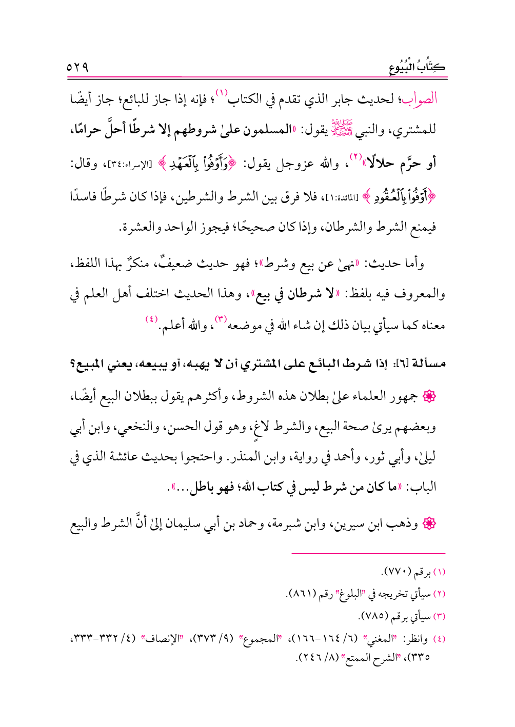 وأما حديث: «نهى عن بيع وشرط»؛ فهو حديث ضعيفٌ، منكرٌ بهذا اللفظ، والمعروف فيه بلفظ: «لا شرطان في بيع»، وهذا الحديث اختلف أهل العلم في معناه كما سيأتي بيان ذلك إن شاء الله في موضعه (¬٣)، والله أعلم. (¬٤)