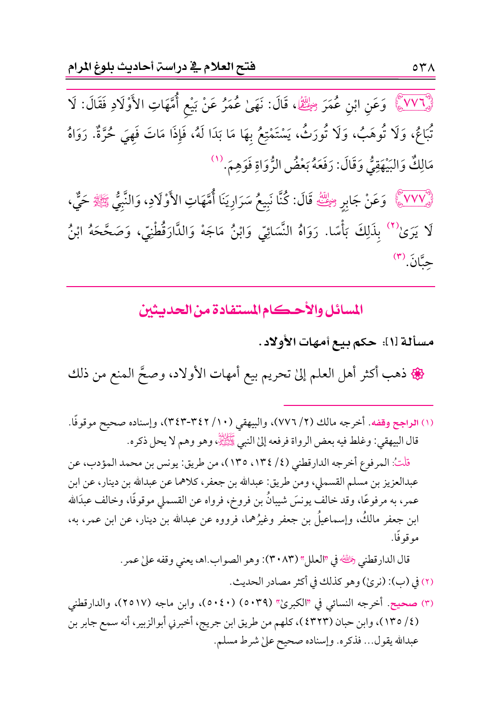 ٧٧٧ - وَعَنْ جَابِرٍ -رضي الله عنه- قَالَ: كُنَّا نَبِيعُ سَرَارِيَنَا أُمَّهَاتِ الأَوْلَادِ، وَالنَّبِيُّ - صلى الله عليه وسلم - حَيٌّ، لَا يَرَى (¬٢) بِذَلِكَ بَأْسًا. رَوَاهُ النَّسَائِيّ وَابْنُ مَاجَهْ وَالدَّارَقُطْنِيّ، وَصَحَّحَهُ ابْنُ حِبَّانَ. (¬٣)