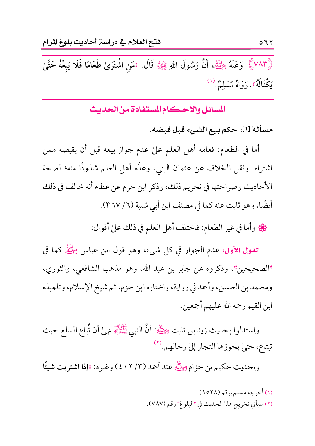 أما في الطعام: فعامة أهل العلم على عدم جواز بيعه قبل أن يقبضه ممن اشتراه. ونقل الخلاف عن عثمان البتي، وعدَّه أهل العلم شذوذًا منه؛ لصحة الأحاديث وصراحتها في تحريم ذلك، وذكر ابن حزم عن عطاء أنه خالف في ذلك أيضًا، وهو ثابت عنه كما في مصنف ابن أبي شيبة (٦/ ٣٦٧).