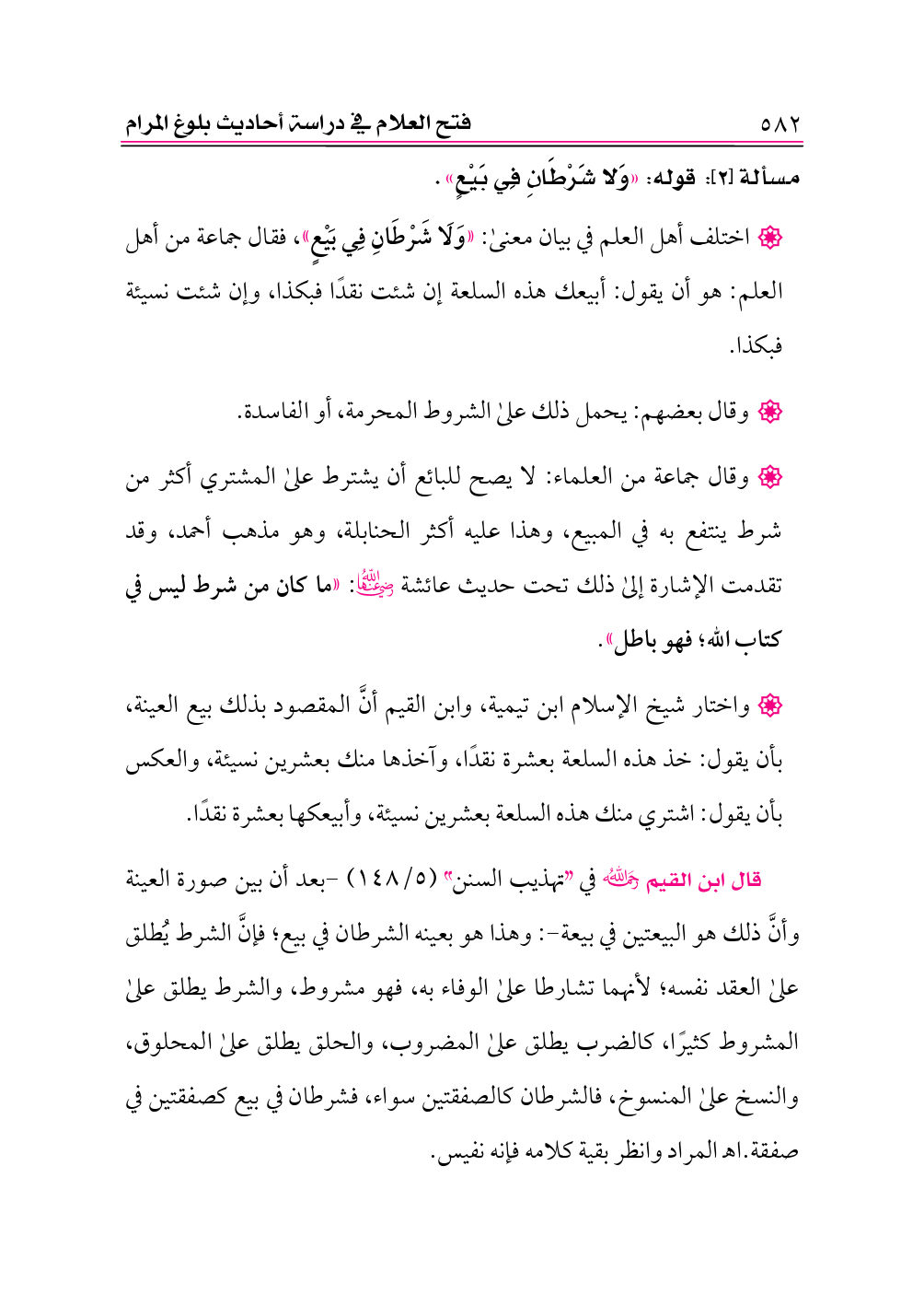 قال ابن القيم -رحمه الله- في «تهذيب السنن» (٥/ ١٤٨) -بعد أن بين صورة العينة وأنَّ ذلك هو البيعتين في بيعة-: وهذا هو بعينه الشرطان في بيع؛ فإنَّ الشرط يُطلق على العقد نفسه؛ لأنهما تشارطا على الوفاء به، فهو مشروط، والشرط يطلق على المشروط كثيرًا، كالضرب يطلق على المضروب، والحلق يطلق على المحلوق، والنسخ على المنسوخ، فالشرطان كالصفقتين سواء، فشرطان في بيع كصفقتين في صفقة. اهـ المراد وانظر بقية كلامه فإنه نفيس.