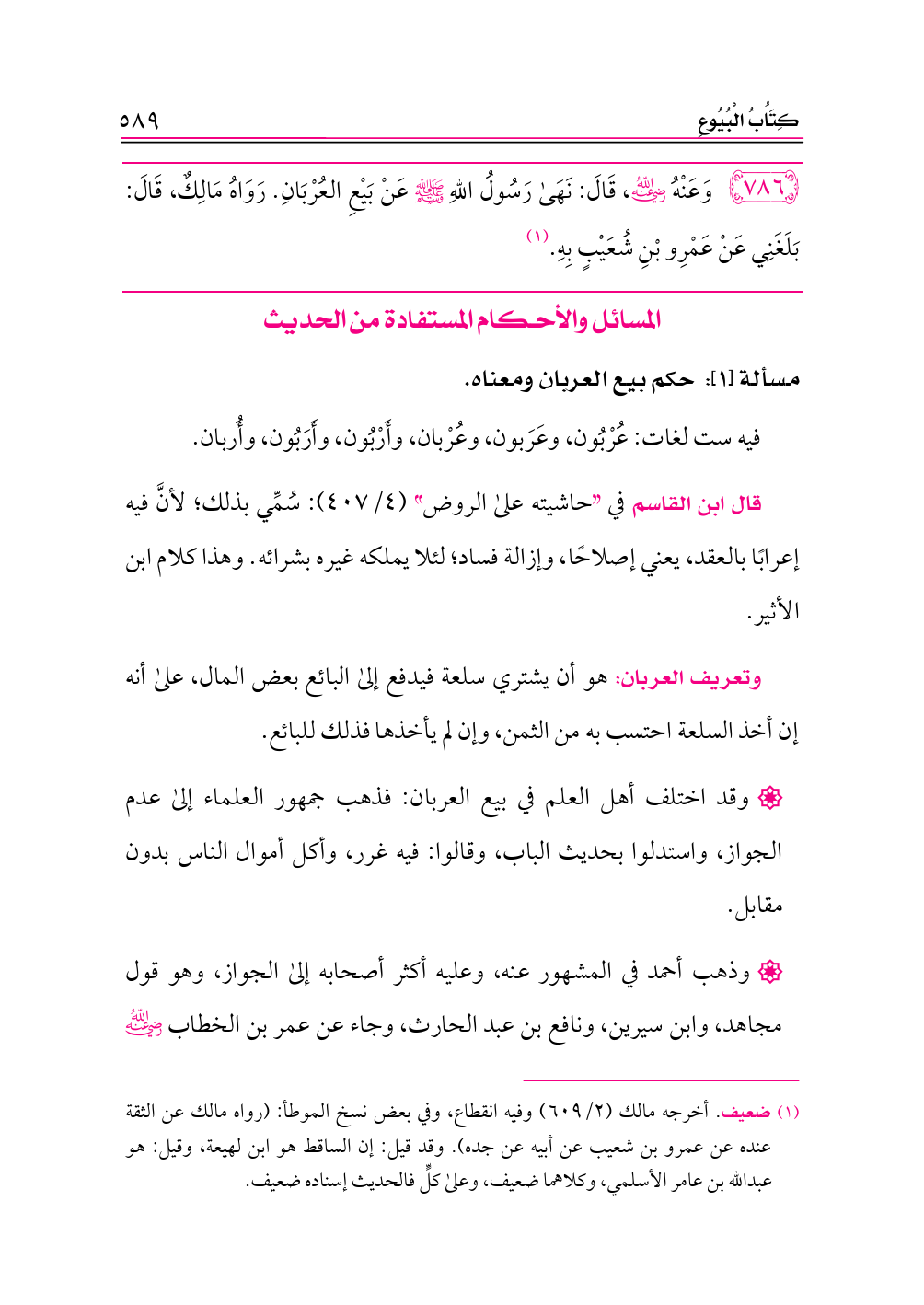 ٧٨٦ - وَعَنْهُ -رضي الله عنه-، قَالَ: نَهَى رَسُولُ اللهِ - صلى الله عليه وسلم - عَنْ بَيْعِ العُرْبَانِ. رَوَاهُ مَالِكٌ، قَالَ: بَلَغَنِي عَنْ عَمْرِو بْنِ شُعَيْبٍ بِهِ. (¬١)