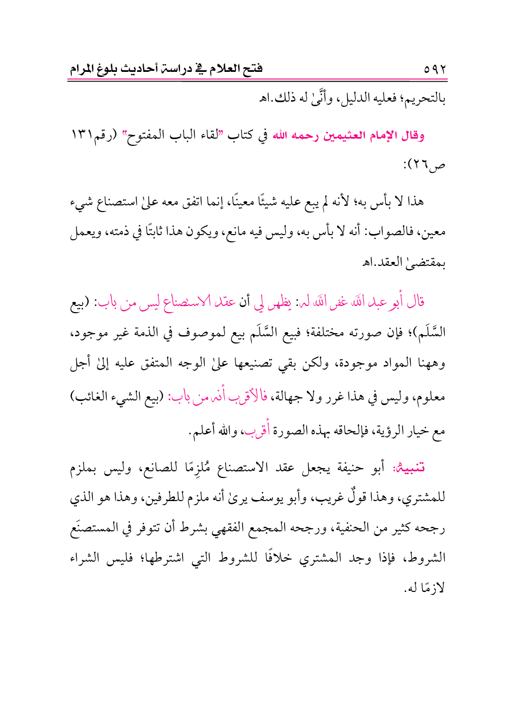 قال أبو عبد الله غفر الله له: يظهر لي أن عقد الاستصناع ليس من باب: (بيع السَّلَم)؛ فإن صورته مختلفة؛ فبيع السَّلَم بيع لموصوف في الذمة غير موجود، وههنا المواد موجودة، ولكن بقي تصنيعها على الوجه المتفق عليه إلى أجل معلوم، وليس في هذا غرر ولا جهالة، فالأقرب أنه من باب: (بيع الشيء الغائب) مع خيار الرؤية، فإلحاقه بهذه الصورة أقرب، والله أعلم.