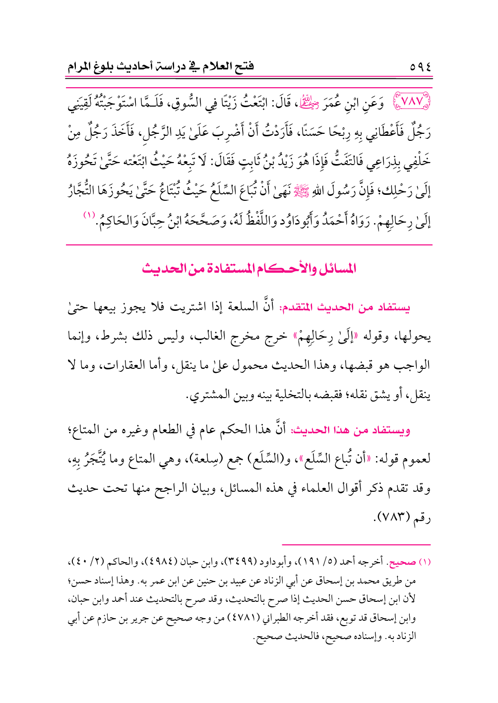 (¬١) صحيح. أخرجه أحمد (٥/ ١٩١)، وأبوداود (٣٤٩٩)، وابن حبان (٤٩٨٤)، والحاكم (٢/ ٤٠)، من طريق محمد بن إسحاق عن أبي الزناد عن عبيد بن حنين عن ابن عمر به. وهذا إسناد حسن؛ لأن ابن إسحاق حسن الحديث إذا صرح بالتحديث، وقد صرح بالتحديث عند أحمد وابن حبان، وابن إسحاق قد توبع، فقد أخرجه الطبراني (٤٧٨١) من وجه صحيح عن جرير بن حازم عن أبي الزناد به. وإسناده صحيح، فالحديث صحيح.