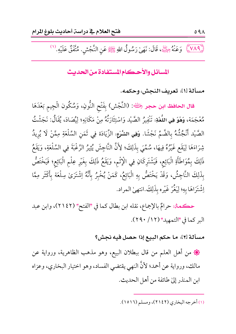 ٧٨٩ - وَعَنْهُ -رضي الله عنه-، قَالَ: نَهَى رَسُولُ اللهِ - صلى الله عليه وسلم - عَنِ النَّجْشِ. مُتَّفَقٌ عَلَيْهِ. (¬١)