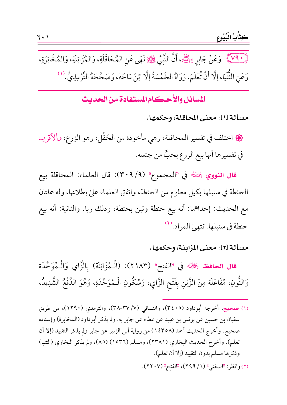 ٧٩٠ - وَعَنْ جَابِرٍ -رضي الله عنه-، أَنَّ النَّبِيَّ - صلى الله عليه وسلم - نَهَى عَنِ المُحَاقَلَةِ، وَالمُزَابَنَةِ، وَالمُخَابَرَةِ، وَعَنِ الثُّنْيَا، إلَّا أَنْ تُعْلَمَ. رَوَاهُ الخَمْسَةُ إلَّا ابْنَ مَاجَهْ، وَصَحَّحَهُ التِّرْمِذِيُّ. (¬١)
