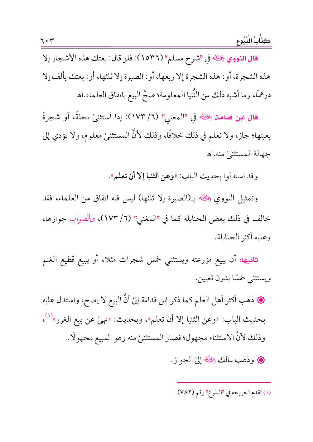 قال النووي -رحمه الله- في «شرح مسلم» (١٥٣٦): فلو قال: بعتك هذه الأشجار إلا هذه الشجرة، أو: هذه الشجرة إلا ربعها، أو: الصبرة إلا ثلثها، أو: بعتك بألف إلا درهمًا، وما أشبه ذلك من الثُنيا المعلومة؛ صحَّ البيع باتفاق العلماء. اهـ