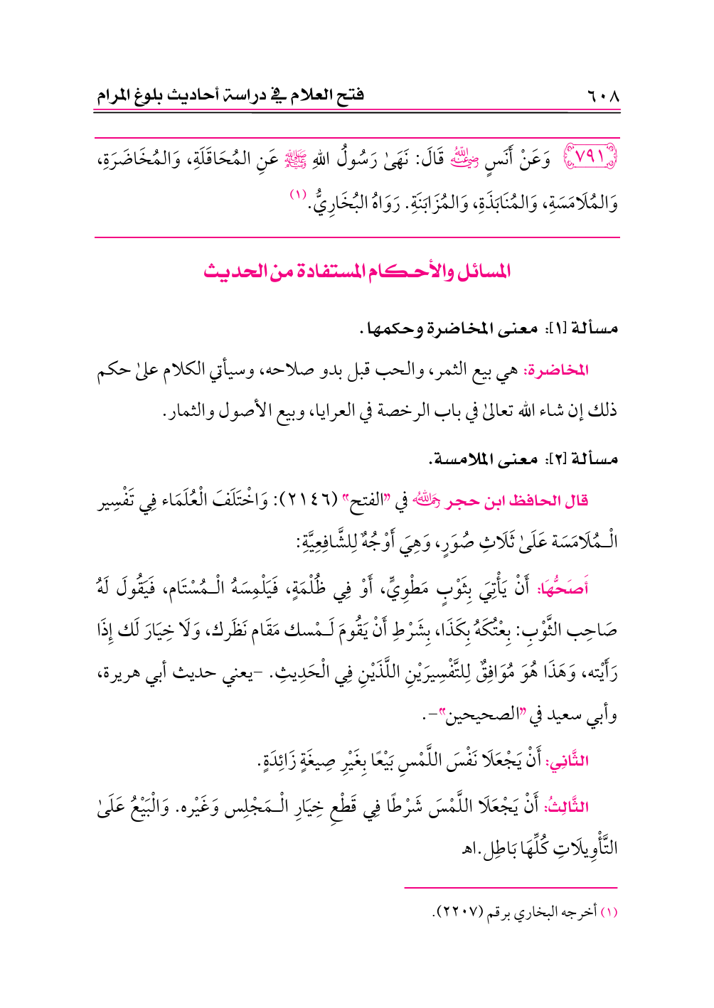 ٧٩١ - وَعَنْ أَنَسٍ -رضي الله عنه- قَالَ: نَهَى رَسُولُ اللهِ - صلى الله عليه وسلم - عَنِ المُحَاقَلَةِ، وَالمُخَاضَرَةِ، وَالمُلَامَسَةِ، وَالمُنَابَذَةِ، وَالمُزَابَنَةِ. رَوَاهُ البُخَارِيُّ. (¬١)