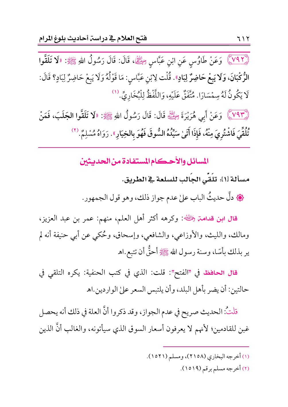 ٧٩٢ - وَعَنْ طَاوُسٍ عَنِ ابْنِ عَبَّاسٍ -رضي الله عنهما-، قَالَ: قَالَ رَسُولُ اللهِ - صلى الله عليه وسلم -: «لَا تَلَقَّوا الرُّكْبَانَ، وَلَا يَبِعْ حَاضِرٌ لِبَادٍ». قُلْت لِابْنِ عَبَّاسٍ: مَا قَوْلُهُ وَلَا يَبِعْ حَاضِرٌ لِبَادٍ؟ قَالَ: لَا يَكُونُ لَهُ سِمْسَارًا. مُتَّفَقٌ عَلَيْهِ، وَاللَّفْظُ لِلْبُخَارِيِّ. (¬١)