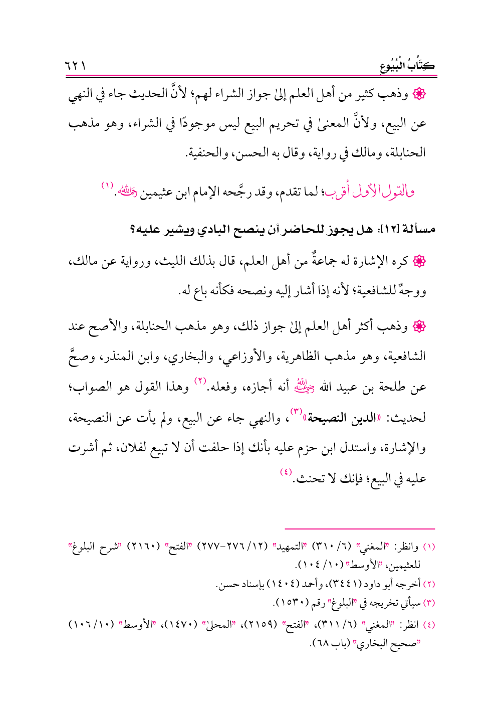 • وذهب أكثر أهل العلم إلى جواز ذلك، وهو مذهب الحنابلة، والأصح عند الشافعية، وهو مذهب الظاهرية، والأوزاعي، والبخاري، وابن المنذر، وصحَّ عن طلحة بن عبيد الله -رضي الله عنه- أنه أجازه، وفعله. (¬٢) وهذا القول هو الصواب؛ لحديث: «الدين النصيحة» (¬٣)، والنهي جاء عن البيع، ولم يأت عن النصيحة، والإشارة، واستدل ابن حزم عليه بأنك إذا حلفت أن لا تبيع لفلان، ثم أشرت عليه في البيع؛ فإنك لا تحنث. (¬٤)