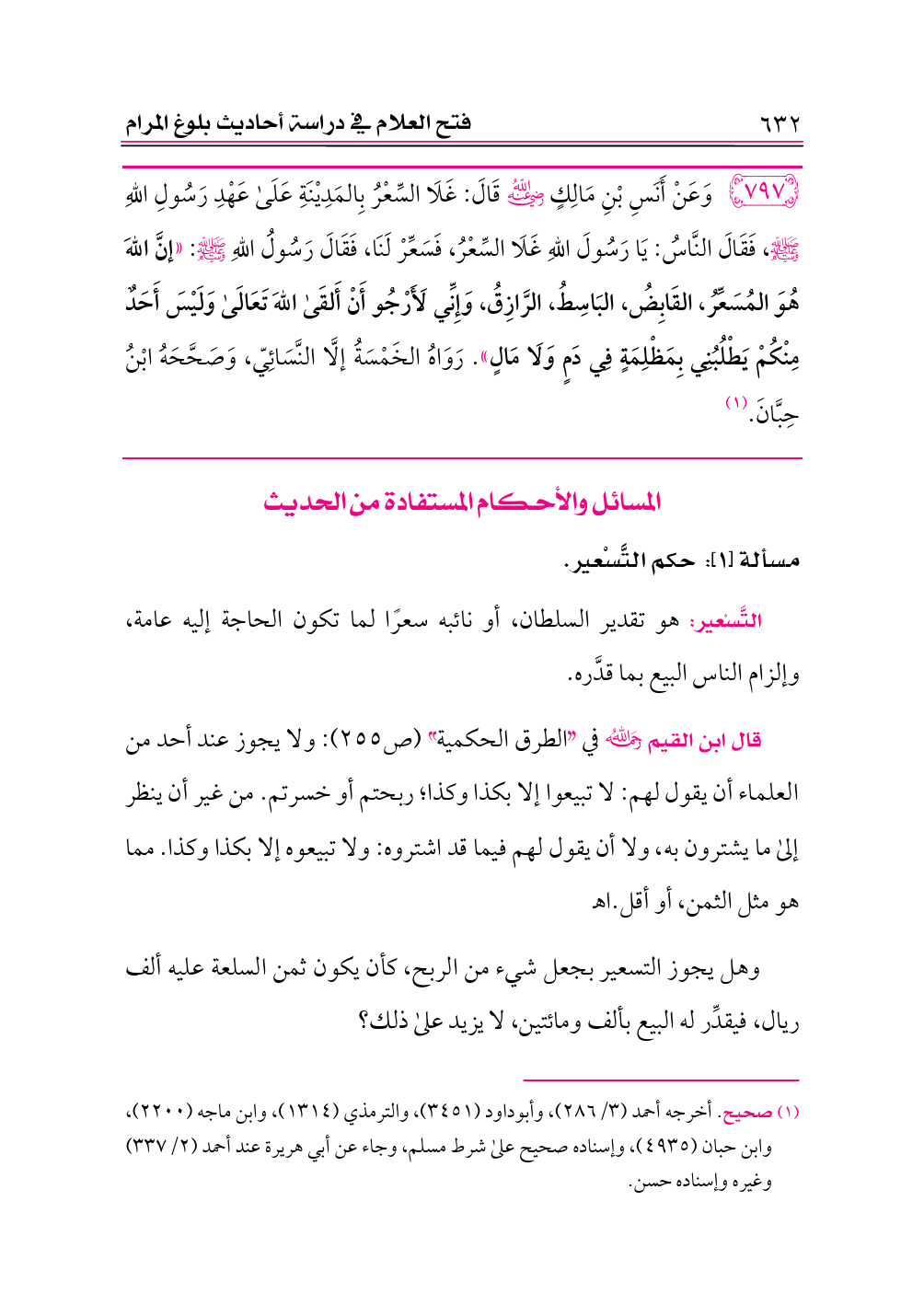 ٧٩٧ - وَعَنْ أَنَسِ بْنِ مَالِكٍ -رضي الله عنه- قَالَ: غَلَا السِّعْرُ بِالمَدِيْنَةِ عَلَى عَهْدِ رَسُولِ اللهِ - صلى الله عليه وسلم -، فَقَالَ النَّاسُ: يَا رَسُولَ اللهِ غَلَا السِّعْرُ، فَسَعِّرْ لَنَا، فَقَالَ رَسُولُ اللهِ - صلى الله عليه وسلم -: «إنَّ اللهَ هُوَ المُسَعِّرُ، القَابِضُ، البَاسِطُ، الرَّازِقُ، وَإِنِّي لَأَرْجُو أَنْ أَلقَى اللهَ تَعَالَى وَلَيْسَ أَحَدٌ مِنْكُمْ يَطْلُبُنِي بِمَظْلِمَةٍ فِي دَمٍ وَلَا مَالٍ». رَوَاهُ الخَمْسَةُ إلَّا النَّسَائِيّ، وَصَحَّحَهُ ابْنُ حِبَّانَ. (¬١)