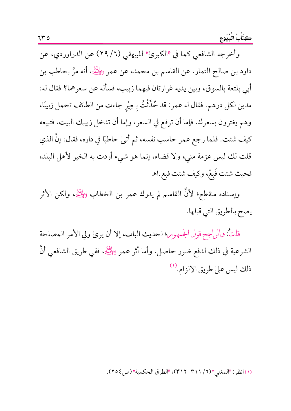 وأخرجه الشافعي كما في «الكبرى» للبيهقي (٦/ ٢٩) عن الدراوردي، عن داود بن صالح التمار، عن القاسم بن محمد، عن عمر -رضي الله عنه-، أنه مرَّ بحاطب بن أبي بلتعة بالسوق، وبين يديه غرارتان فيهما زبيب، فسأله عن سعرهما؟ فقال له: مدين لكل درهم. فقال له عمر: قد حُدِّثْتُ بِعِيْرٍ جاءت من الطائف تحمل زبيبًا، وهم يغترون بسعرك، فإما أن ترفع في السعر، وإما أن تدخل زبيبك البيت، فتبيعه كيف شئت. فلما رجع عمر حاسب نفسه، ثم أتى حاطبًا في داره، فقال: إنَّ الذي قلت لك ليس عزمة مني، ولا قضاء، إنما هو شيء أردت به الخير لأهل البلد، فحيث شئت فَبِعْ، وكيف شئت فبع. اهـ