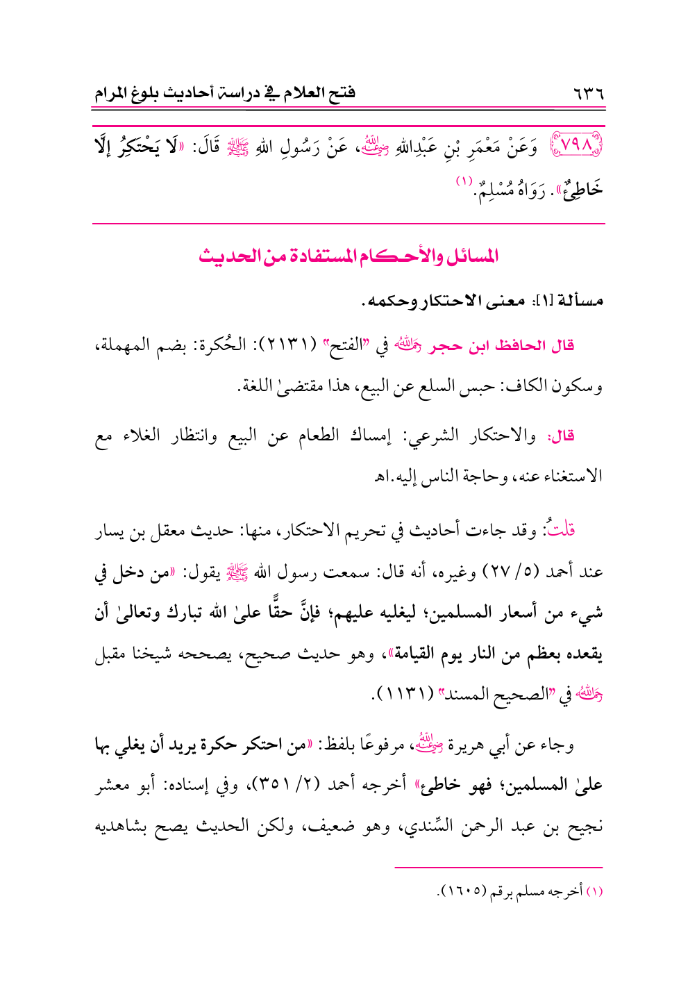 ٧٩٨ - وَعَنْ مَعْمَرِ بْنِ عَبْدِاللهِ -رضي الله عنه-، عَنْ رَسُولِ اللهِ - صلى الله عليه وسلم - قَالَ: «لَا يَحْتَكِرُ إلَّا خَاطِئٌ». رَوَاهُ مُسْلِمٌ. (¬١)