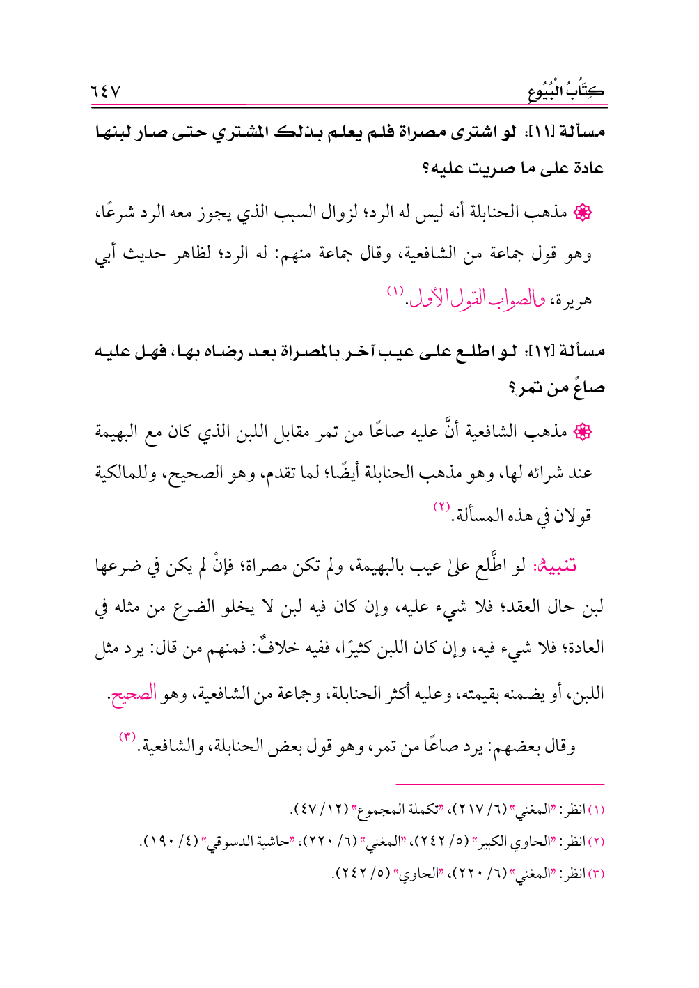تنبيه: لو اطَّلع على عيب بالبهيمة، ولم تكن مصراة؛ فإنْ لم يكن في ضرعها لبن حال العقد؛ فلا شيء عليه، وإن كان فيه لبن لا يخلو الضرع من مثله في العادة؛ فلا شيء فيه، وإن كان اللبن كثيرًا، ففيه خلافٌ: فمنهم من قال: يرد مثل اللبن، أو يضمنه بقيمته، وعليه أكثر الحنابلة، وجماعة من الشافعية، وهو الصحيح.