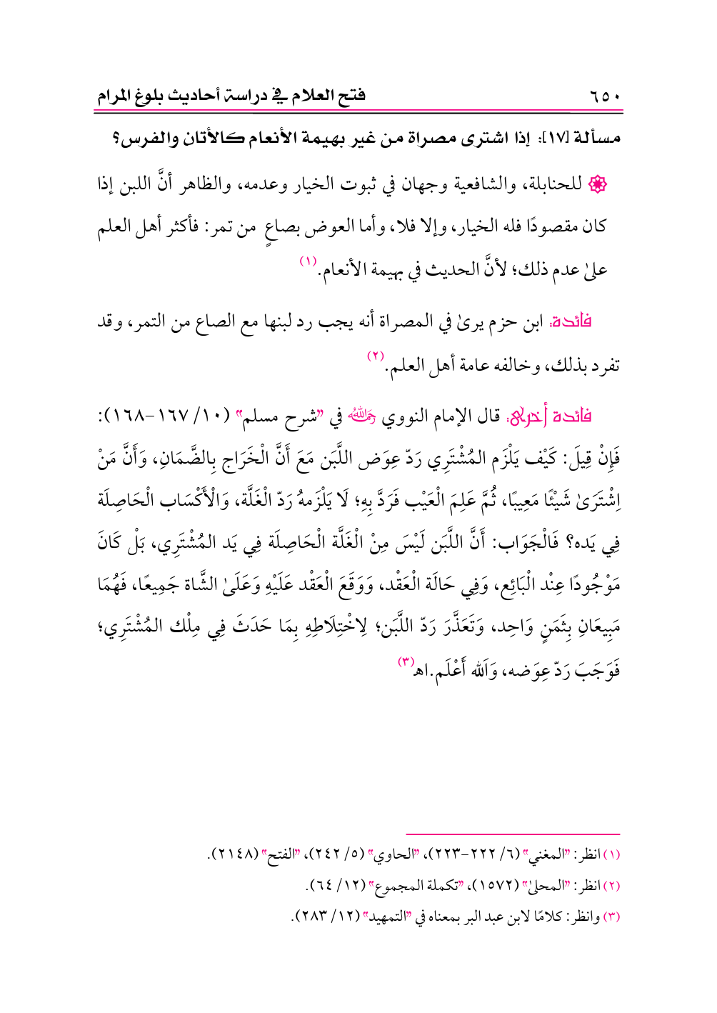 فائدة أخرى: قال الإمام النووي -رحمه الله- في «شرح مسلم» (١٠/ ١٦٧ - ١٦٨): فَإِنْ قِيلَ: كَيْف يَلْزَم المُشْتَرِي رَدّ عِوَض اللَّبَن مَعَ أَنَّ الْخَرَاج بِالضَّمَانِ، وَأَنَّ مَنْ اِشْتَرَى شَيْئًا مَعِيبًا، ثُمَّ عَلِمَ الْعَيْب فَرَدَّ بِهِ؛ لَا يَلْزَمهُ رَدّ الْغَلَّة، وَالْأَكْسَاب الْحَاصِلَة فِي يَده؟ فَالْجَوَاب: أَنَّ اللَّبَن لَيْسَ مِنْ الْغَلَّة الْحَاصِلَة فِي يَد المُشْتَرِي، بَلْ كَانَ مَوْجُودًا عِنْد الْبَائِع، وَفِي حَالَة الْعَقْد، وَوَقَعَ الْعَقْد عَلَيْهِ وَعَلَى الشَّاة جَمِيعًا، فَهُمَا مَبِيعَانِ بِثَمَنٍ وَاحِد، وَتَعَذَّرَ رَدّ اللَّبَن؛ لِاخْتِلَاطِهِ بِمَا حَدَثَ فِي مِلْك المُشْتَرِي؛ فَوَجَبَ رَدّ عِوَضه، وَاَلله أَعْلَم. اهـ (¬٣)