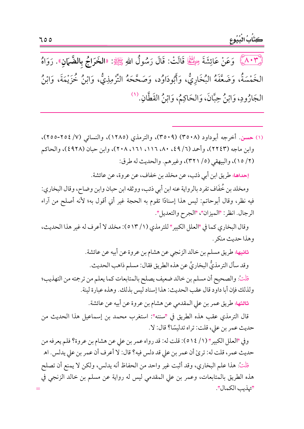 ٨٠٣ - وَعَنْ عَائِشَةَ -رضي الله عنها- قَالَتْ: قَالَ رَسُولُ اللهِ - صلى الله عليه وسلم -: «الخَرَاجُ بِالضَّمَانِ». رَوَاهُ الخَمْسَةُ، وَضَعَّفَهُ البُخَارِيُّ، وَأَبُودَاوُد، وَصَحَّحَهُ التِّرْمِذِيُّ، وَابْنُ خُزَيْمَةَ، وَابْنُ الجَارُودِ، وَابْنُ حِبَّانَ، وَالحَاكِمُ، وَابْنُ القَطَّانِ. (¬١)