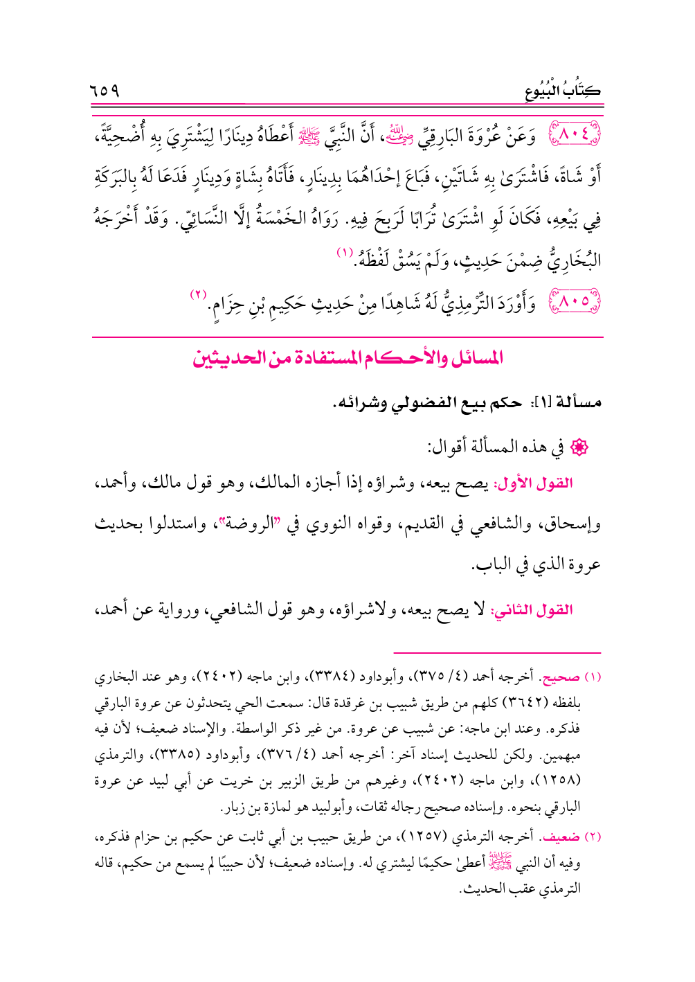 (¬١) صحيح. أخرجه أحمد (٤/ ٣٧٥)، وأبوداود (٣٣٨٤)، وابن ماجه (٢٤٠٢)، وهو عند البخاري بلفظه (٣٦٤٢) كلهم من طريق شبيب بن غرقدة قال: سمعت الحي يتحدثون عن عروة البارقي فذكره. وعند ابن ماجه: عن شبيب عن عروة. من غير ذكر الواسطة. والإسناد ضعيف؛ لأن فيه مبهمين. ولكن للحديث إسناد آخر: أخرجه أحمد (٤/ ٣٧٦)، وأبوداود (٣٣٨٥)، والترمذي (١٢٥٨)، وابن ماجه (٢٤٠٢)، وغيرهم من طريق الزبير بن خريت عن أبي لبيد عن عروة البارقي بنحوه. وإسناده صحيح رجاله ثقات، وأبولبيد هو لمازة بن زبار.