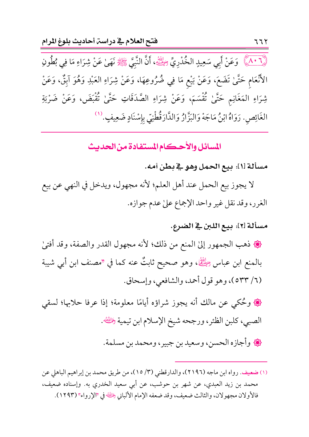 • وحُكي عن مالك أنه يجوز شراؤه أيامًا معلومة؛ إذا عرفا حلابها؛ لسقي الصبي، كلبن الظئر، ورجحه شيخ الإسلام ابن تيمية -رحمه الله-.