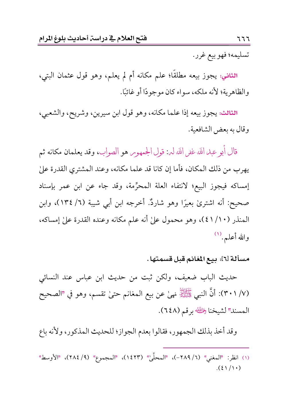 قال أبو عبد الله غفر الله له: قول الجمهور هو الصواب، وقد يعلمان مكانه ثم يهرب من ذلك المكان، فأما إن كانا قد علما مكانه، وعند المشتري القدرة على إمساكه فيجوز البيع؛ لانتفاء العلة المحرِّمة، وقد جاء عن ابن عمر بإسناد صحيح: أنه اشترى بعيرًا وهو شاردٌ. أخرجه ابن أبي شيبة (٦/ ١٣٤)، وابن المنذر (١٠/ ٤١)، وهو محمول على أنه علم مكانه وعنده القدرة على إمساكه، والله أعلم. (¬١)