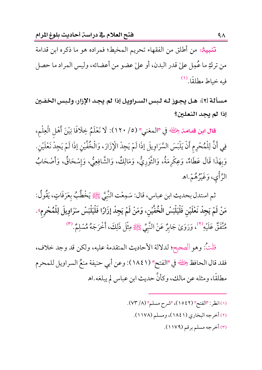 ثم استدل بحديث ابن عباس، قال: سَمِعْت النَّبِيَّ - صلى الله عليه وسلم - يَخْطُبُ بِعَرَفَاتٍ، يَقُولُ: مَنْ لَمْ يَجِدْ نَعْلَيْنِ فَلْيَلْبَسْ الْخُفَّيْنِ، وَمَنْ لَمْ يَجِدْ إزَارًا فَلْيَلْبَسْ سَرَاوِيلَ لِلْمُحْرِمِ». مُتَّفَقٌ عَلَيْهِ (¬٢)، وَرَوَى جَابِرٌ عَنْ النَّبِيِّ - صلى الله عليه وسلم - مِثْلَ ذَلِكَ، أَخْرَجَهُ مُسْلِمٌ. (¬٣)