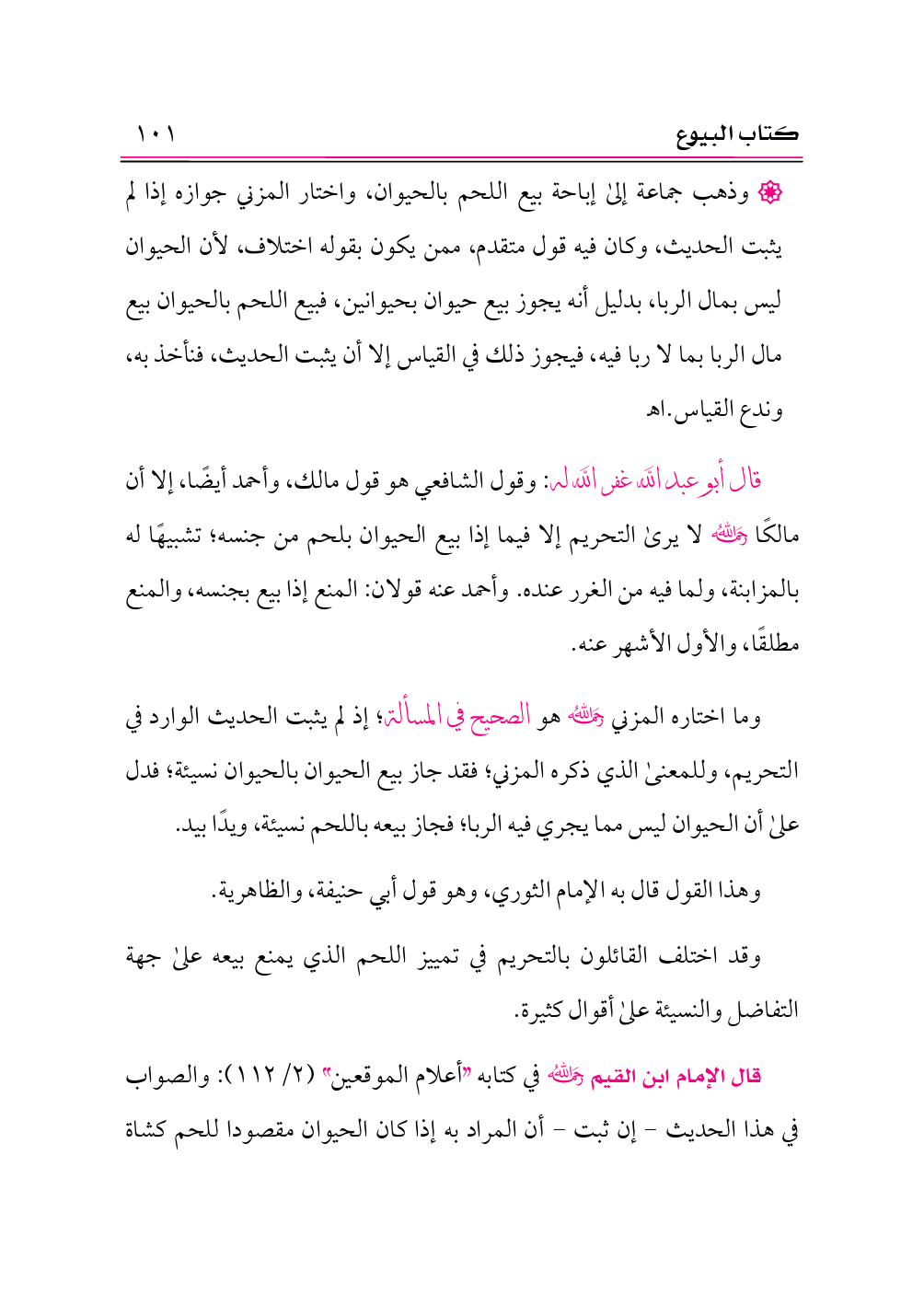 وما اختاره المزني -رحمه الله- هو الصحيح في المسألة؛ إذ لم يثبت الحديث الوارد في التحريم، وللمعنى الذي ذكره المزني؛ فقد جاز بيع الحيوان بالحيوان نسيئة؛ فدل على أن الحيوان ليس مما يجري فيه الربا؛ فجاز بيعه باللحم نسيئة، ويدًا بيد.