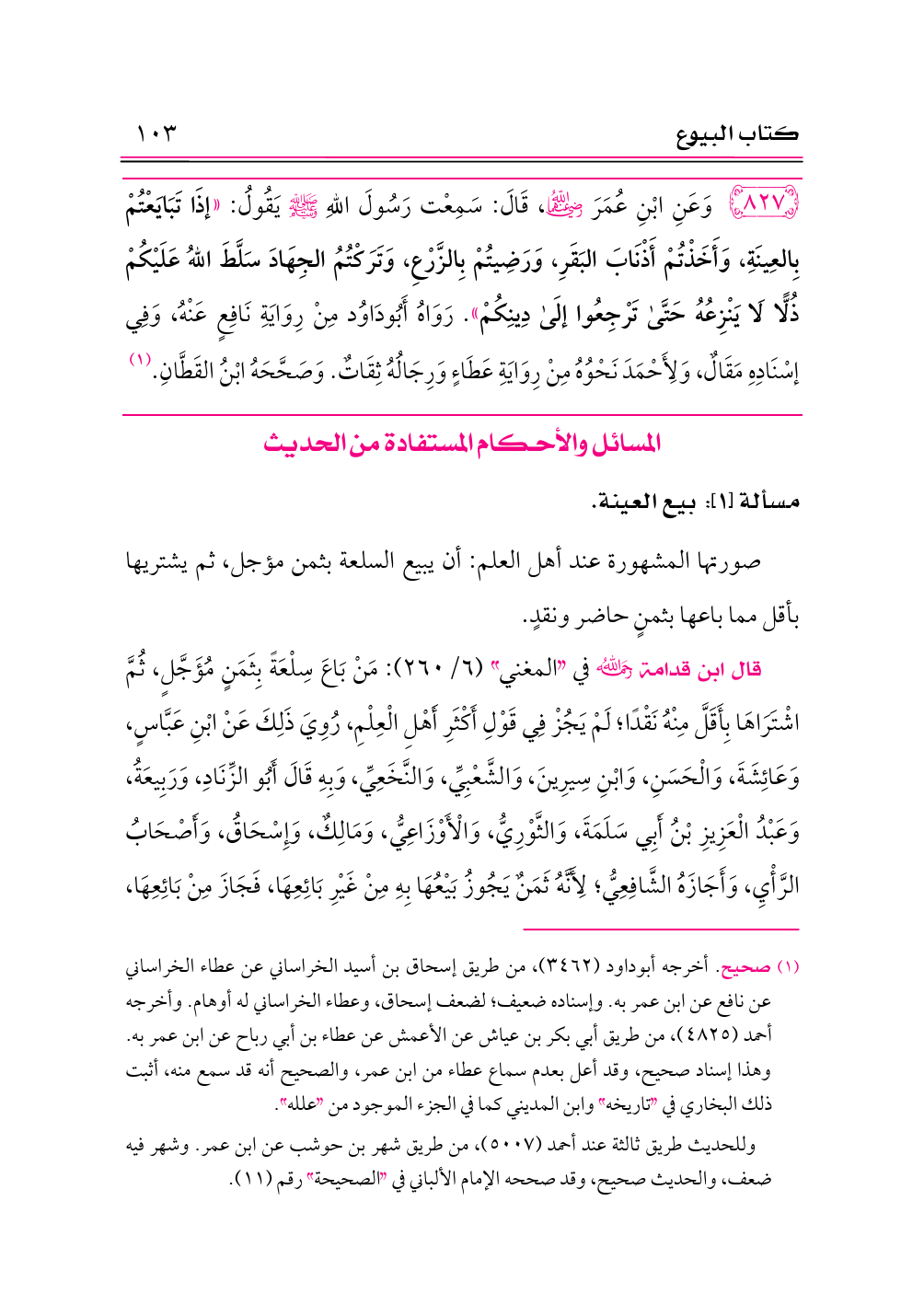 ٨٢٧ - وَعَنِ ابْنِ عُمَرَ -رضي الله عنهما-، قَالَ: سَمِعْت رَسُولَ اللهِ - صلى الله عليه وسلم - يَقُولُ: «إذَا تَبَايَعْتُمْ بِالعِينَةِ، وَأَخَذْتُمْ أَذْنَابَ البَقَرِ، وَرَضِيتُمْ بِالزَّرْعِ، وَتَرَكْتُمُ الجِهَادَ سَلَّطَ اللهُ عَلَيْكُمْ ذُلًّا لَا يَنْزِعُهُ حَتَّى تَرْجِعُوا إلَى دِينِكُمْ». رَوَاهُ أَبُودَاوُد مِنْ رِوَايَةِ نَافِعٍ عَنْهُ، وَفِي إسْنَادِهِ مَقَالٌ، وَلِأَحْمَدَ نَحْوُهُ مِنْ رِوَايَةِ عَطَاءٍ وَرِجَالُهُ ثِقَاتٌ. وَصَحَّحَهُ ابْنُ القَطَّانِ. (¬١)
