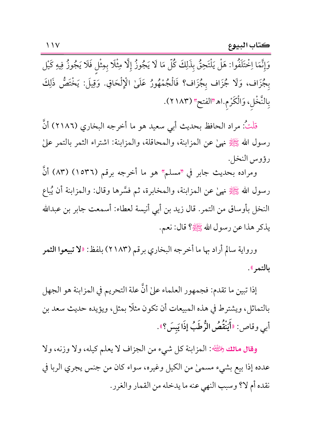 وقال مالك -رحمه الله-: المزابنة كل شيء من الجزاف لا يعلم كيله، ولا وزنه، ولا عدده إذا بيع بشيء مسمى من الكيل وغيره، سواء كان من جنس يجري الربا في نقده أم لا؟ وسبب النهي عنه ما يدخله من القمار والغرر.