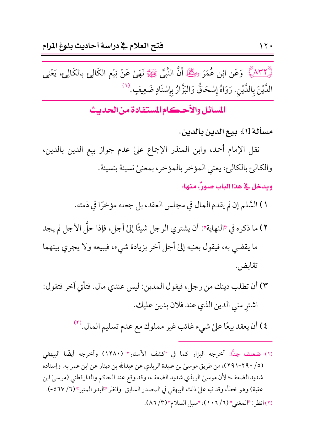 ٨٣٢ - وَعَنِ ابْنِ عُمَرَ -رضي الله عنهما- أَنَّ النَّبِيَّ - صلى الله عليه وسلم - نَهَى عَنْ بَيْعِ الكَالِئِ بِالكَالِئِ، يَعْنِي الدَّيْنَ بِالدَّيْنِ. رَوَاهُ إِسْحَاقُ وَالبَزَّارُ بِإِسْنَادٍ ضَعِيفٍ. (¬١)