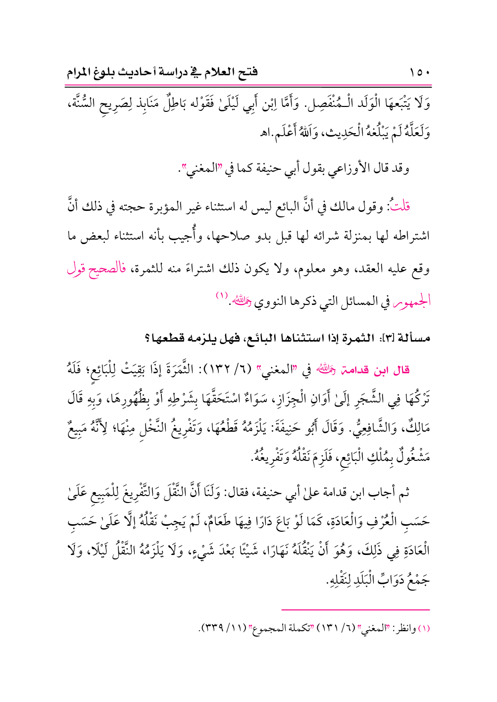 قلتُ: وقول مالك في أنَّ البائع ليس له استثناء غير المؤبرة حجته في ذلك أنَّ اشتراطه لها بمنزلة شرائه لها قبل بدو صلاحها، وأُجيب بأنه استثناء لبعض ما وقع عليه العقد، وهو معلوم، ولا يكون ذلك اشتراءً منه للثمرة، فالصحيح قول الجمهور في المسائل التي ذكرها النووي -رحمه الله-. (¬١)