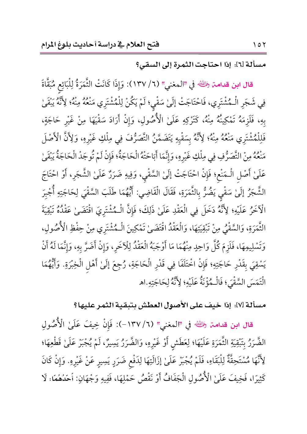 قال ابن قدامة -رحمه الله- في «المغني» (٦/ ١٣٧): وَإِذَا كَانَتْ الثَّمَرَةُ لِلْبَائِعٍ مُبَقَّاةً فِي شَجَرِ الْمُشْتَرِي، فَاحْتَاجَتْ إلَى سَقْيٍ؛ لَمْ يَكُنْ لِلْمُشْتَرِي مَنْعُهُ مِنْهُ؛ لِأَنَّهُ يَبْقَى بِهِ، فَلَزِمَهُ تَمْكِينُهُ مِنْهُ، كَتَرْكِهِ عَلَى الْأُصُولِ، وَإِنْ أَرَادَ سَقْيَهَا مِنْ غَيْرِ حَاجَةٍ، فَلِلْمُشْتَرِي مَنْعُهُ مِنْهُ؛ لِأَنَّهُ بِسَقْيِهِ يَتَضَمَّنُ التَّصَرُّفَ فِي مِلْكِ غَيْرِهِ، وَلِأَنَّ الْأَصْلَ مَنْعُهُ مِنْ التَّصَرُّفِ فِي مِلْكِ غَيْرِهِ، وَإِنَّمَا أَبَاحَتْهُ الْحَاجَةُ؛ فَإِنْ لَمْ تُوجَدْ الْحَاجَةُ يَبْقَى عَلَى أَصْلِ الْمَنْعِ؛ فَإِنْ احْتَاجَتْ إلَى السَّقْيِ، وَفِيهِ ضَرَرٌ عَلَى الشَّجَرِ، أَوْ احْتَاجَ الشَّجَرُ إلَى سَقْيٍ يَضُرُّ بِالثَّمَرَةِ، فَقَالَ الْقَاضِي: أَيُّهُمَا طَلَبَ السَّقْيَ لِحَاجَتِهِ أُجْبِرَ الْآخَرُ عَلَيْهِ؛ لِأَنَّهُ دَخَلَ فِي الْعَقْدِ عَلَى ذَلِكَ؛ فَإِنَّ الْمُشْتَرِيَ اقْتَضَى عَقْدُهُ تَبْقِيَةَ الثَّمَرَةِ، وَالسَّقْيُ مِنْ تَبْقِيَتِهَا، وَالْعَقْدُ اقْتَضَى تَمْكِينَ الْمُشْتَرِي مِنْ حِفْظِ الْأُصُولِ، وَتَسْلِيمِهَا، فَلَزِمَ كُلَّ وَاحِدٍ مِنْهُمَا مَا أَوْجَبَهُ الْعَقْدُ لِلْآخَرِ، وَإِنْ أَضَرَّ بِهِ، وَإِنَّمَا لَهُ أَنْ يَسْقِيَ بِقَدْرِ حَاجَتِهِ؛ فَإِنْ اخْتَلَفَا فِي قَدْرِ الْحَاجَةِ، رُجِعَ إلَى أَهْلِ الْخِبْرَةِ. وَأَيُّهُمَا الْتَمَسَ السَّقْيَ؛ فَالْمُؤْنَةُ عَلَيْهِ؛ لِأَنَّهُ لِحَاجَتِهِ. اهـ