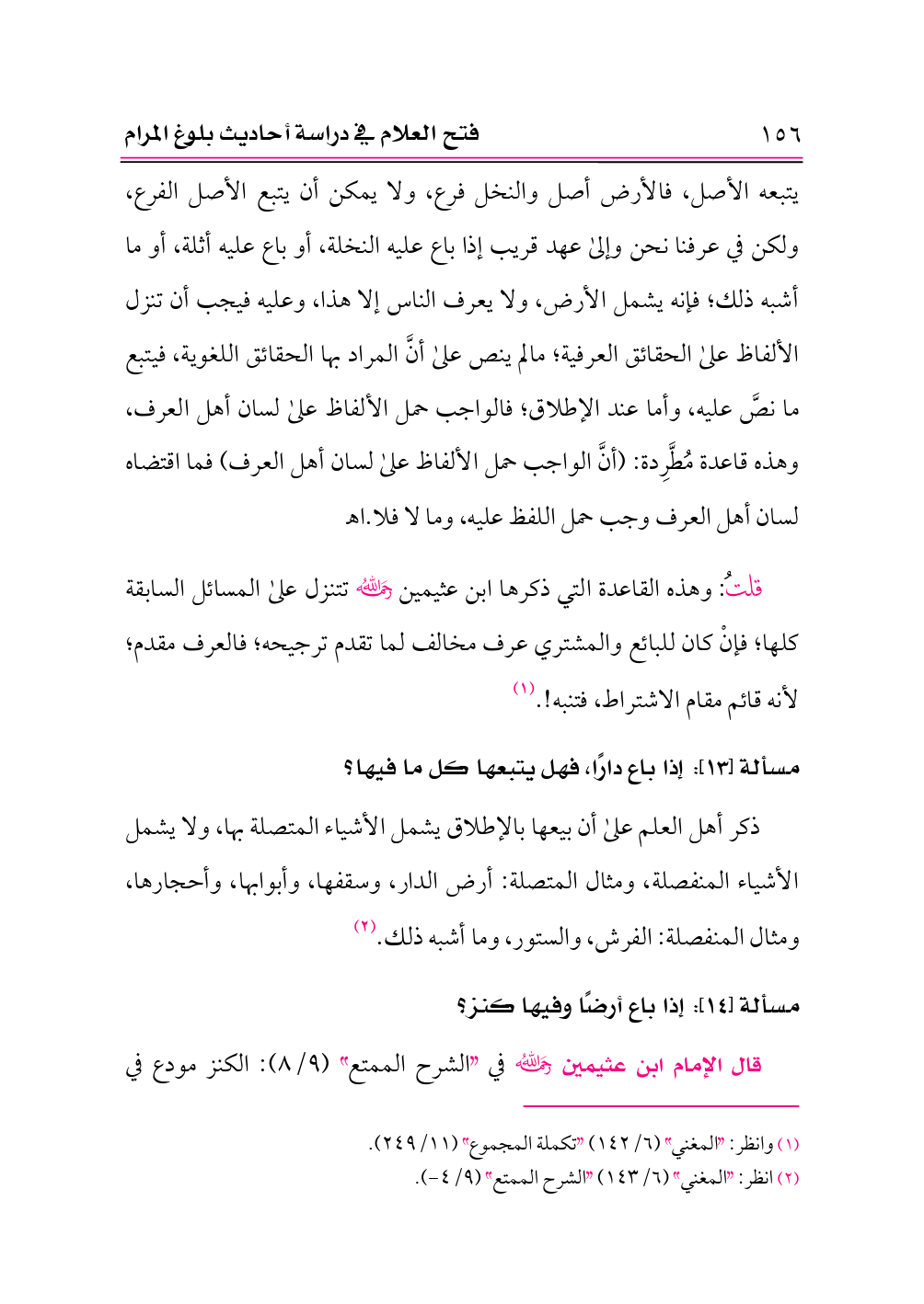 قلتُ: وهذه القاعدة التي ذكرها ابن عثيمين -رحمه الله- تتنزل على المسائل السابقة كلها؛ فإنْ كان للبائع والمشتري عرف مخالف لما تقدم ترجيحه؛ فالعرف مقدم؛ لأنه قائم مقام الاشتراط، فتنبه!. (¬١)