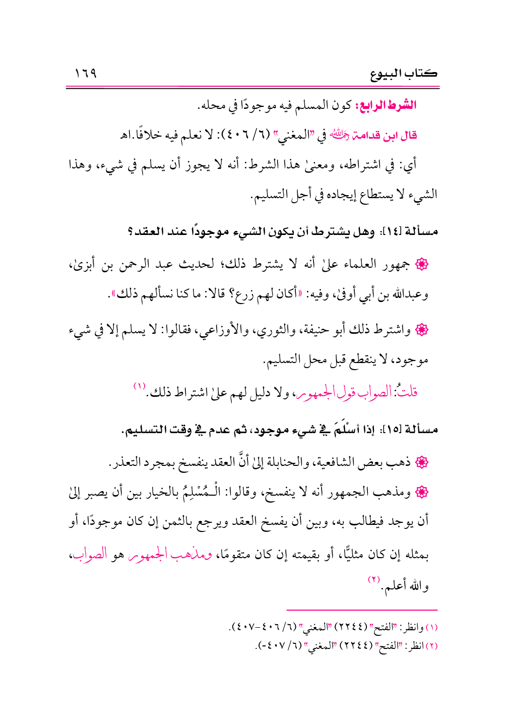 • ومذهب الجمهور أنه لا ينفسخ، وقالوا: الْمُسْلِمُ بالخيار بين أن يصبر إلى أن يوجد فيطالب به، وبين أن يفسخ العقد ويرجع بالثمن إن كان موجودًا، أو بمثله إن كان مثليًّا، أو بقيمته إن كان متقومًا، ومذهب الجمهور هو الصواب، والله أعلم. (¬٢)