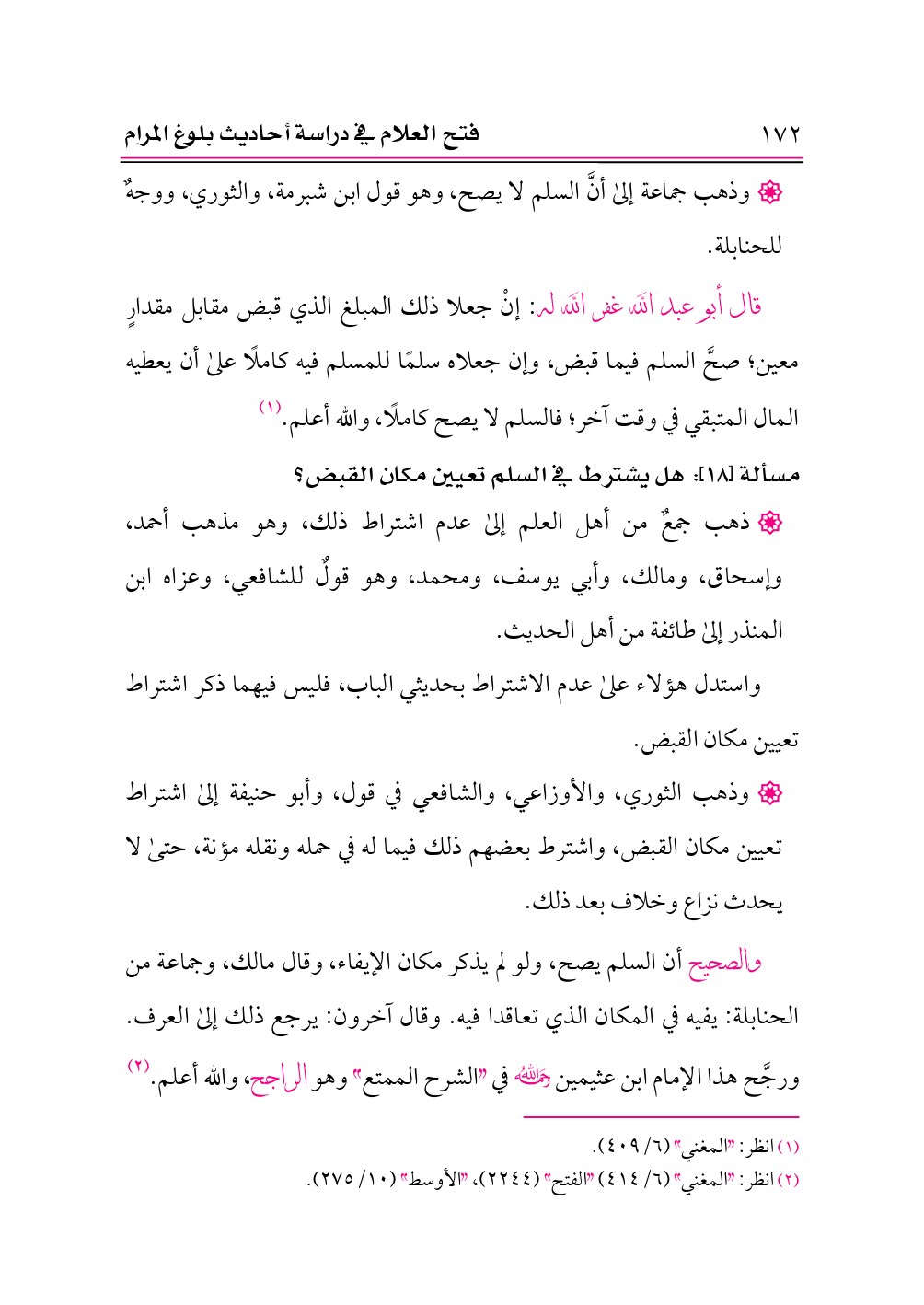 والصحيح أن السلم يصح، ولو لم يذكر مكان الإيفاء، وقال مالك، وجماعة من الحنابلة: يفيه في المكان الذي تعاقدا فيه. وقال آخرون: يرجع ذلك إلى العرف. ورجَّح هذا الإمام ابن عثيمين -رحمه الله- في «الشرح الممتع» وهو الراجح، والله أعلم. (¬٢)