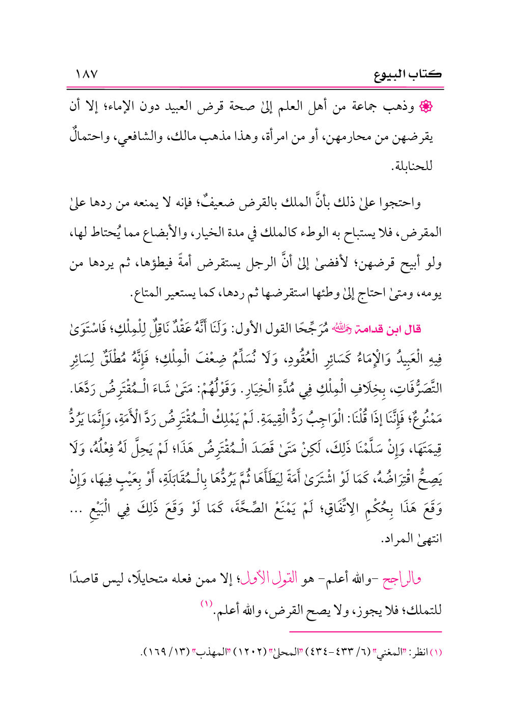 قال ابن قدامة -رحمه الله- مُرَجِّحًا القول الأول: وَلَنَا أَنَّهُ عَقْدٌ نَاقِلٌ لِلْمِلْكِ؛ فَاسْتَوَى فِيهِ الْعَبِيدُ وَالْإِمَاءُ كَسَائِرِ الْعُقُودِ، وَلَا نُسَلِّمُ ضِعْفَ الْمِلْكِ؛ فَإِنَّهُ مُطْلَقٌ لِسَائِرِ التَّصَرُّفَاتِ، بِخِلَافِ الْمِلْكِ فِي مُدَّةِ الْخِيَارِ. وَقَوْلُهُمْ: مَتَى شَاءَ الْمُقْتَرِضُ رَدَّهَا. مَمْنُوعٌ؛ فَإِنَّنَا إذَا قُلْنَا: الْوَاجِبُ رَدُّ الْقِيمَةِ. لَمْ يَمْلِكْ الْمُقْتَرِضُ رَدَّ الْأَمَةِ، وَإِنَّمَا يَرُدُّ قِيمَتَهَا، وَإِنْ سَلَّمْنَا ذَلِكَ، لَكِنْ مَتَى قَصَدَ الْمُقْتَرِضُ هَذَا؛ لَمْ يَحِلَّ لَهُ فِعْلُهُ، وَلَا يَصِحُّ اقْتِرَاضُهُ، كَمَا لَوْ اشْتَرَى أَمَةً لِيَطَأَهَا ثُمَّ يَرُدُّهَا بِالْمُقَابَلَةِ، أَوْ بِعَيْبٍ فِيهَا، وَإِنْ وَقَعَ هَذَا بِحُكْمِ الِاتِّفَاقِ؛ لَمْ يَمْنَعْ الصِّحَّةَ، كَمَا لَوْ وَقَعَ ذَلِكَ فِي الْبَيْعِ ... انتهى المراد.