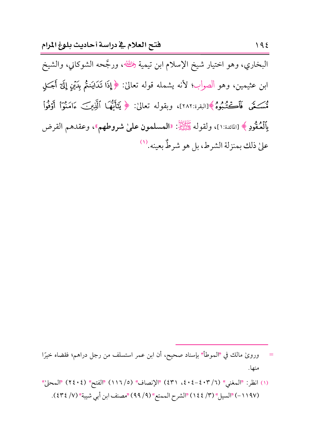 البخاري، وهو اختيار شيخ الإسلام ابن تيمية -رحمه الله-، ورجَّحه الشوكاني، والشيخ ابن عثيمين، وهو الصواب؛ لأنه يشمله قوله تعالى: {إِذَا تَدَايَنْتُمْ بِدَيْنٍ إِلَى أَجَلٍ مُسَمًّى فَاكْتُبُوهُ} [البقرة:٢٨٢]، وبقوله تعالى: {يَاأَيُّهَا الَّذِينَ آمَنُوا أَوْفُوا بِالْعُقُودِ} [المائدة:١]، ولقوله -صلى الله عليه وعلى آله وسلم-: «المسلمون على شروطهم»، وعقدهم القرض على ذلك بمنزلة الشرط، بل هو شرطٌ بعينه. (¬١)