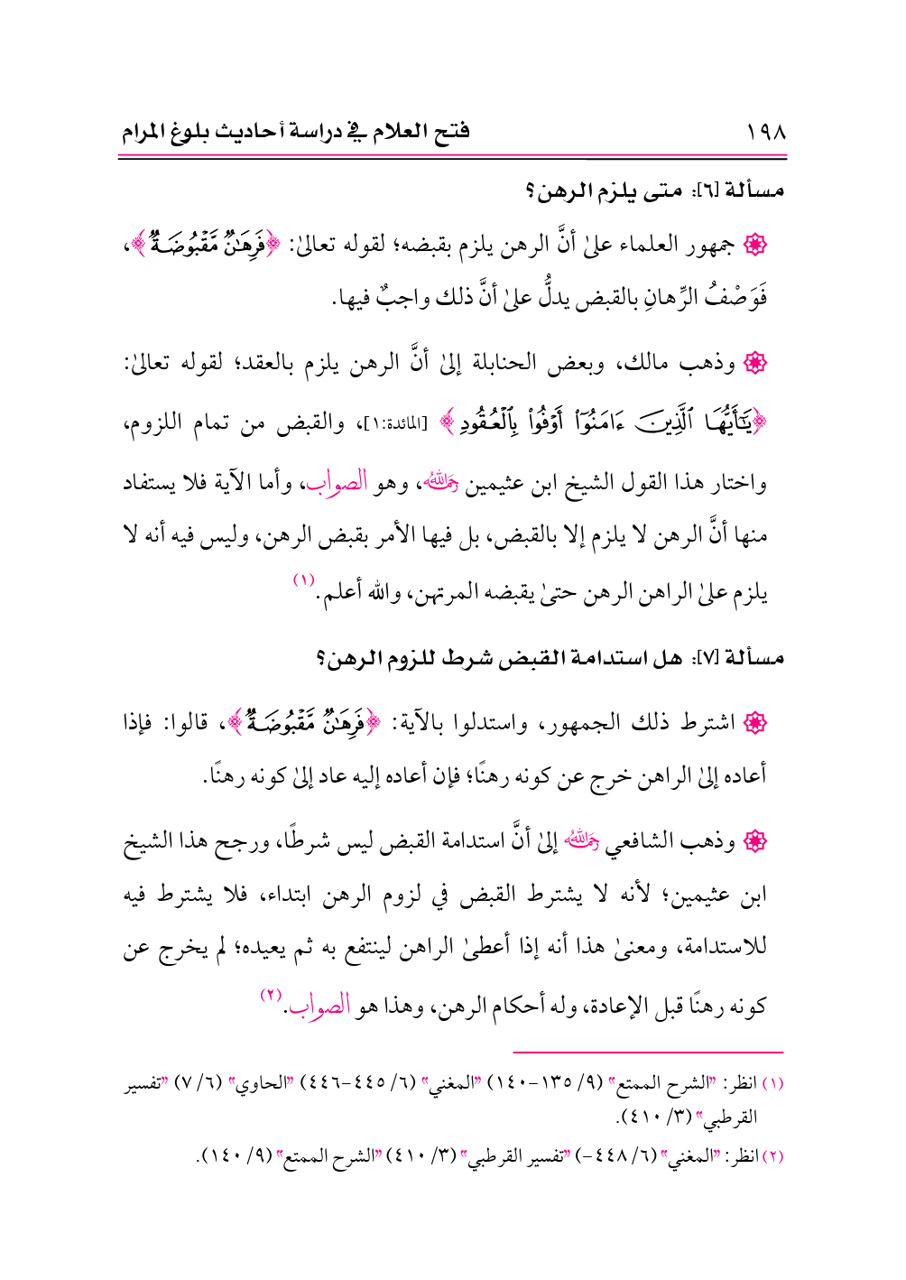 • وذهب مالك، وبعض الحنابلة إلى أنَّ الرهن يلزم بالعقد؛ لقوله تعالى: {يَاأَيُّهَا الَّذِينَ آمَنُوا أَوْفُوا بِالْعُقُودِ} [المائدة:١]، والقبض من تمام اللزوم، واختار هذا القول الشيخ ابن عثيمين -رحمه الله-، وهو الصواب، وأما الآية فلا يستفاد منها أنَّ الرهن لا يلزم إلا بالقبض، بل فيها الأمر بقبض الرهن، وليس فيه أنه لا يلزم على الراهن الرهن حتى يقبضه المرتهن، والله أعلم. (¬١)