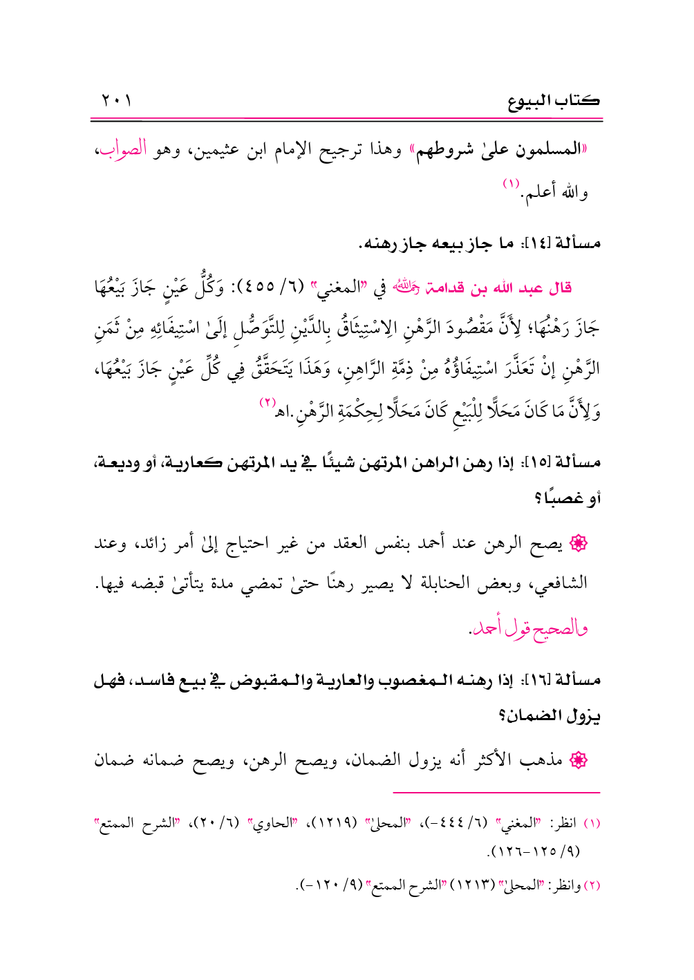 «المسلمون على شروطهم» وهذا ترجيح الإمام ابن عثيمين، وهو الصواب، والله أعلم. (¬١)