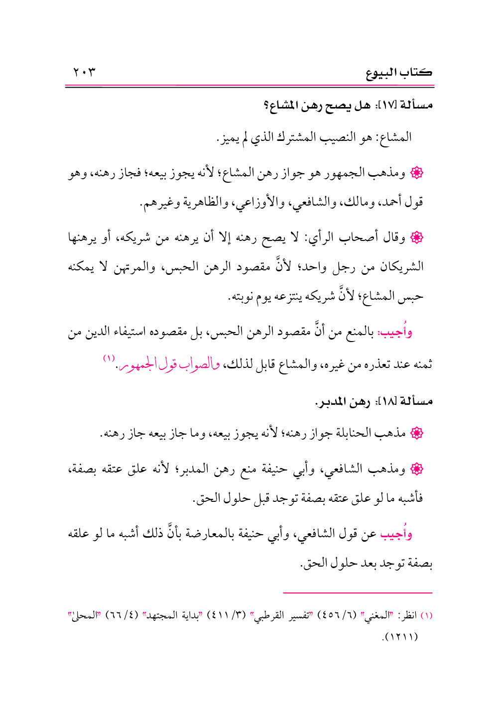 وأُجيب: بالمنع من أنَّ مقصود الرهن الحبس، بل مقصوده استيفاء الدين من ثمنه عند تعذره من غيره، والمشاع قابل لذلك، والصواب قول الجمهور. (¬١)