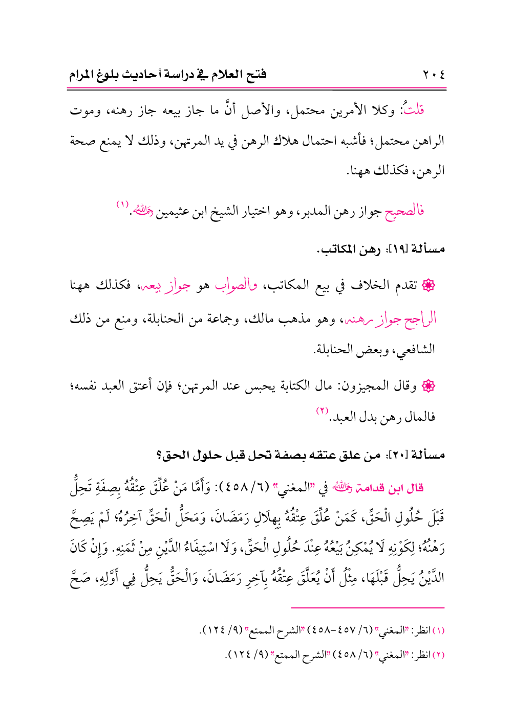• تقدم الخلاف في بيع المكاتب، والصواب هو جواز بيعه، فكذلك ههنا الراجح جواز رهنه، وهو مذهب مالك، وجماعة من الحنابلة، ومنع من ذلك الشافعي، وبعض الحنابلة.