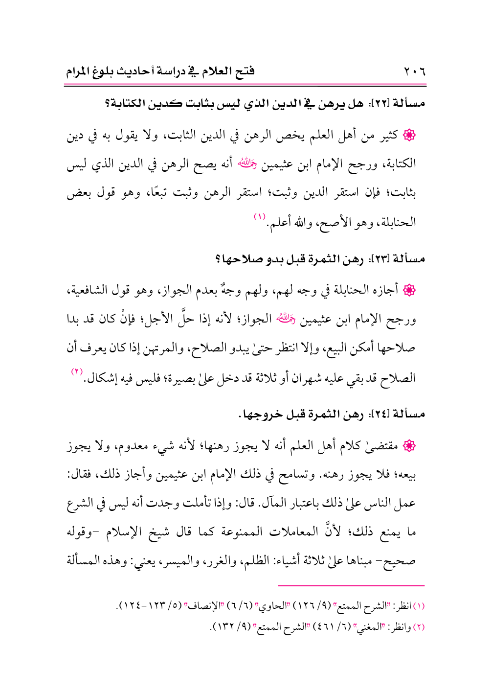 • كثير من أهل العلم يخص الرهن في الدين الثابت، ولا يقول به في دين الكتابة، ورجح الإمام ابن عثيمين -رحمه الله- أنه يصح الرهن في الدين الذي ليس بثابت؛ فإن استقر الدين وثبت؛ استقر الرهن وثبت تبعًا، وهو قول بعض الحنابلة، وهو الأصح، والله أعلم. (¬١)