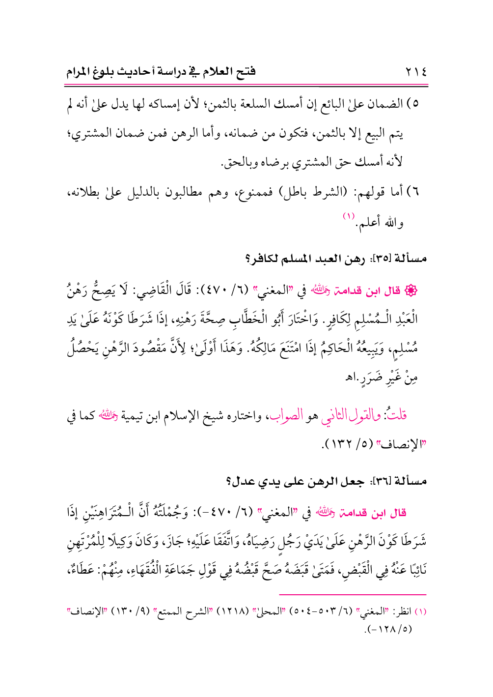٦) أما قولهم: (الشرط باطل) فممنوع، وهم مطالبون بالدليل على بطلانه، والله أعلم. (¬١)