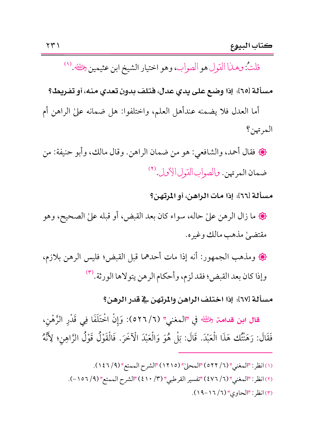 • فقال أحمد، والشافعي: هو من ضمان الراهن. وقال مالك، وأبو حنيفة: من ضمان المرتهن. والصواب القول الأول. (¬٢)