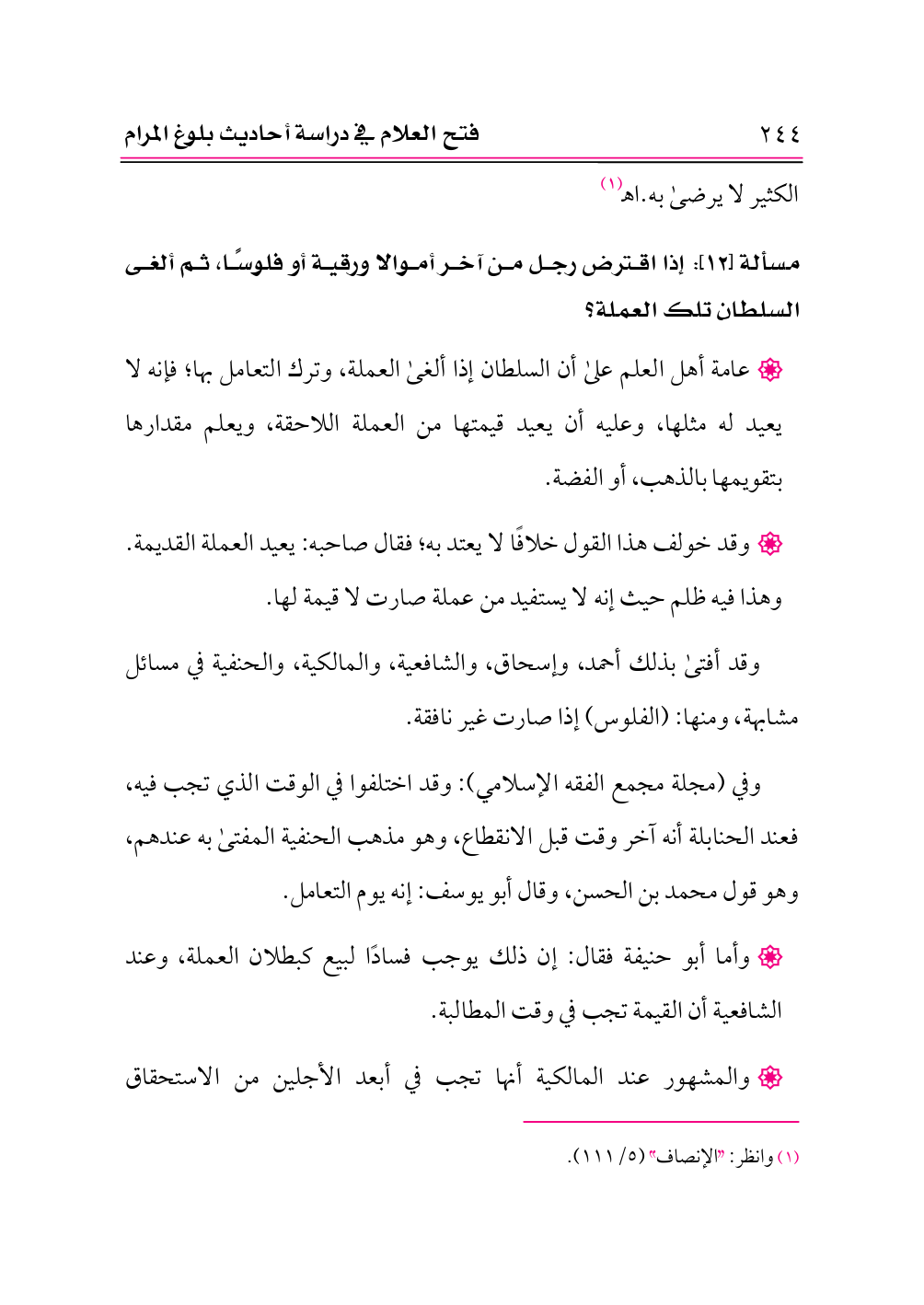 مسألة [١٢]: إذا اقترض رجل من آخر أموالا ورقية أو فلوسًا، ثم ألغى السلطان تلك العملة؟