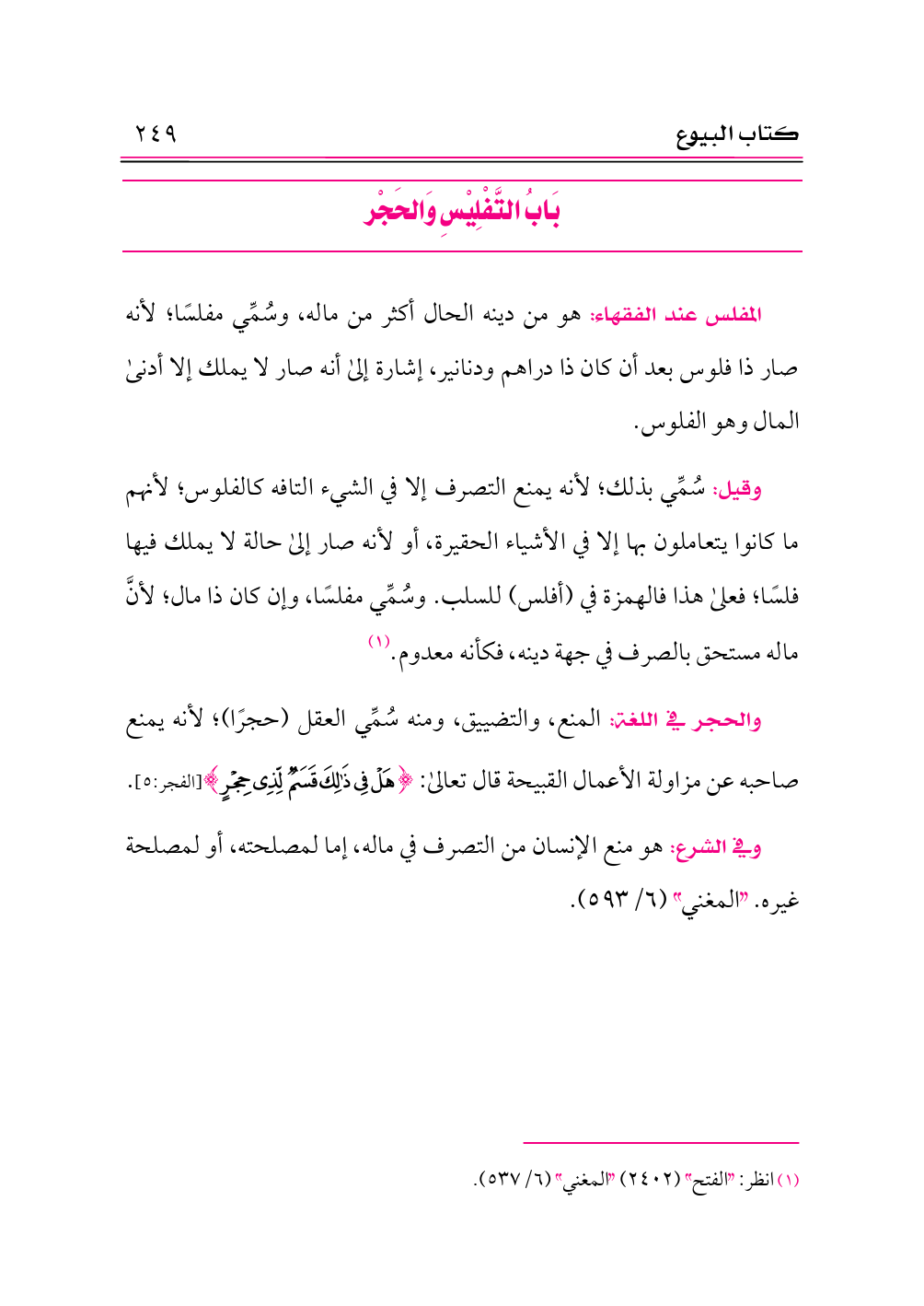 وقيل: سُمِّي بذلك؛ لأنه يمنع التصرف إلا في الشيء التافه كالفلوس؛ لأنهم ما كانوا يتعاملون بها إلا في الأشياء الحقيرة، أو لأنه صار إلى حالة لا يملك فيها فلسًا؛ فعلى هذا فالهمزة في (أفلس) للسلب. وسُمِّي مفلسًا، وإن كان ذا مال؛ لأنَّ ماله مستحق بالصرف في جهة دينه، فكأنه معدوم. (¬١)