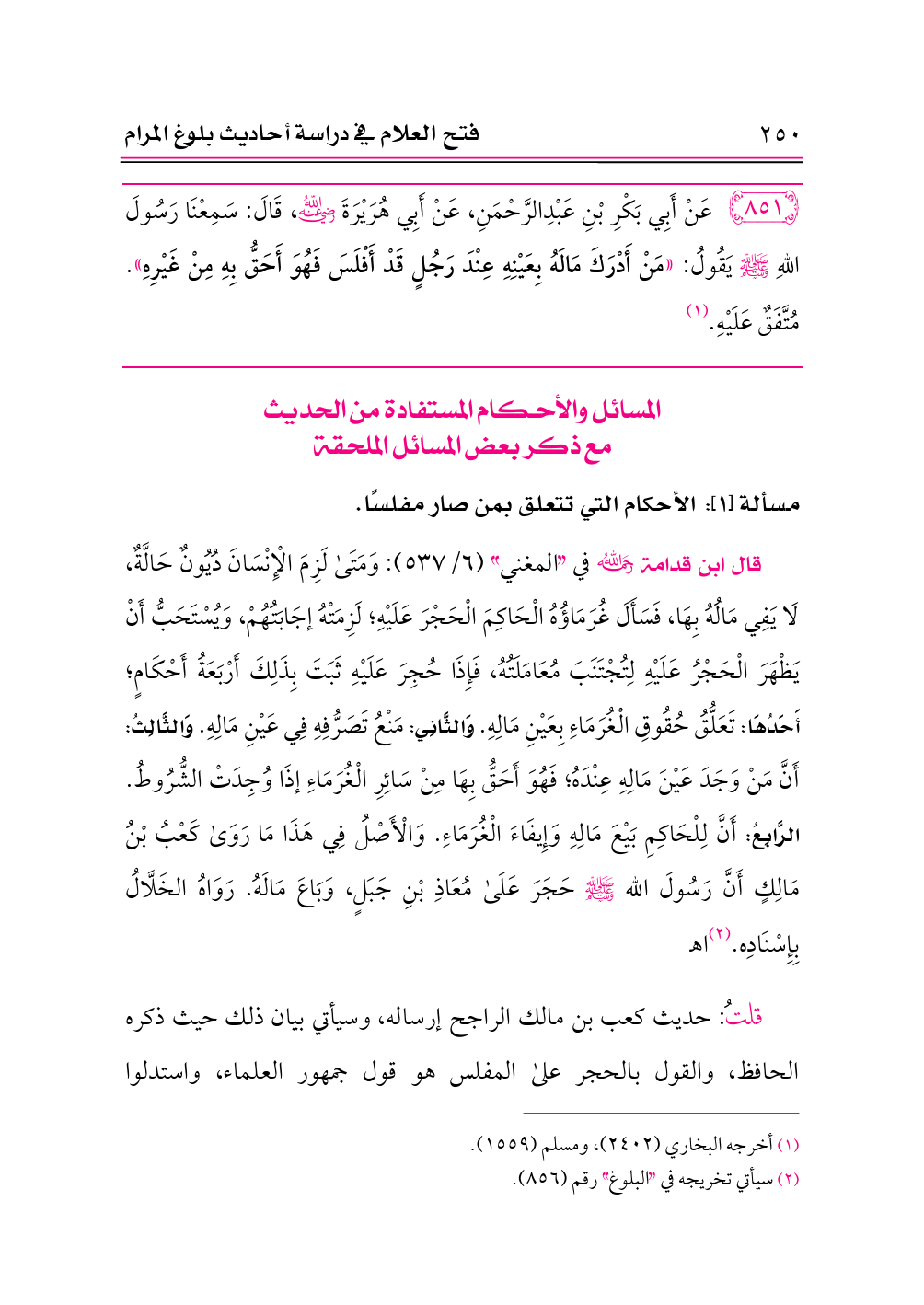 ٨٥١ - عَنْ أَبِي بَكْرِ بْنِ عَبْدِالرَّحْمَنِ، عَنْ أَبِي هُرَيْرَةَ -رضي الله عنه-، قَالَ: سَمِعْنَا رَسُولَ اللهِ - صلى الله عليه وسلم - يَقُولُ: «مَنْ أَدْرَكَ مَالَهُ بِعَيْنِهِ عِنْدَ رَجُلٍ قَدْ أَفْلَسَ فَهُوَ أَحَقُّ بِهِ مِنْ غَيْرِهِ». مُتَّفَقٌ عَلَيْهِ. (¬١)